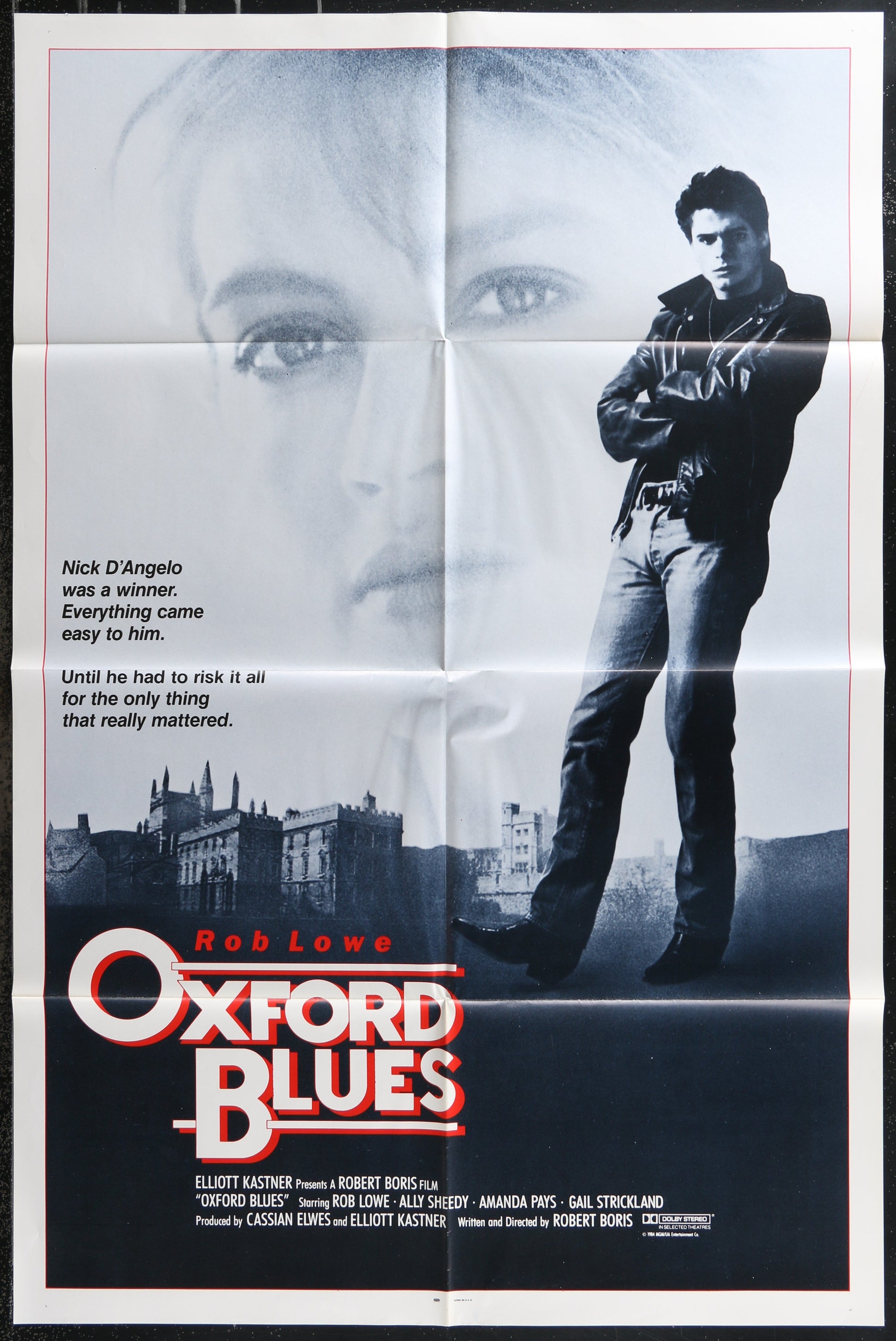 This Original US One Sheet Movie Poster for Oxford Blues (1984) measures 27" x 41" (69 x 104 cm) and features Rob Lowe and Ally Sheedy in the Robert Boris directed university rowing comedy. There is edge and fold wear, as well as some creasing along the vertical fold.
