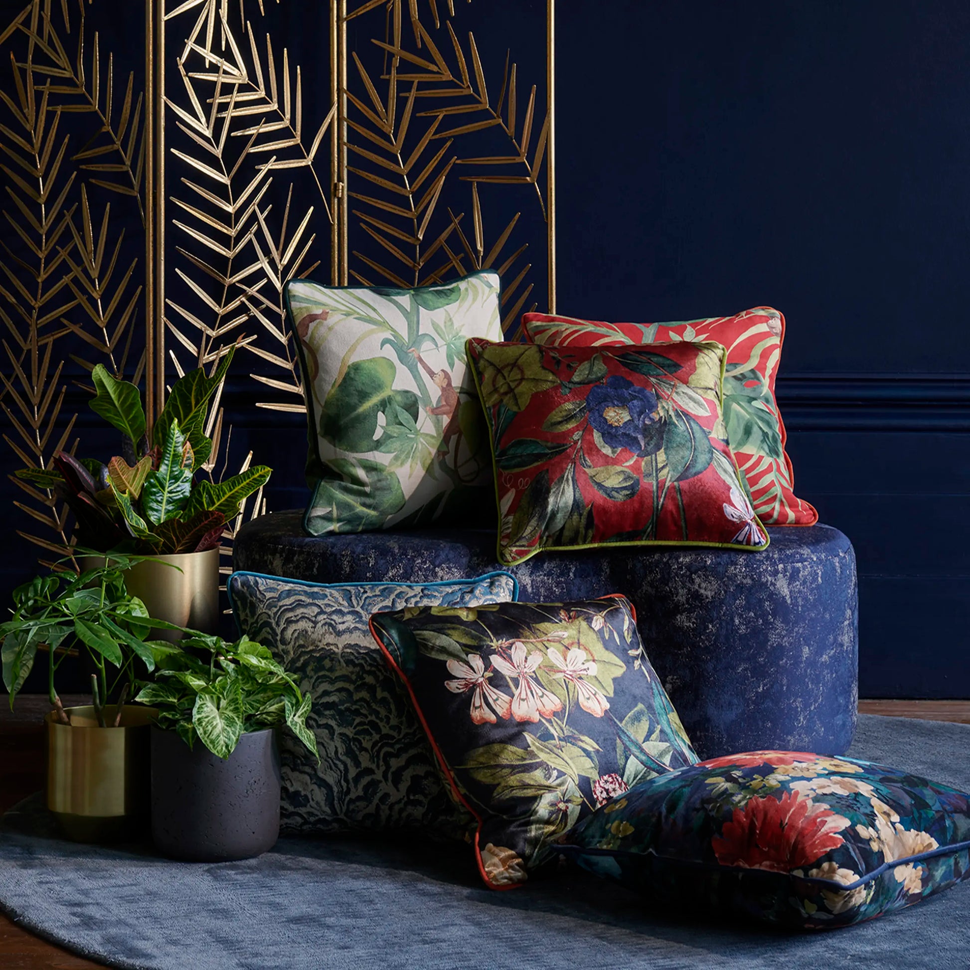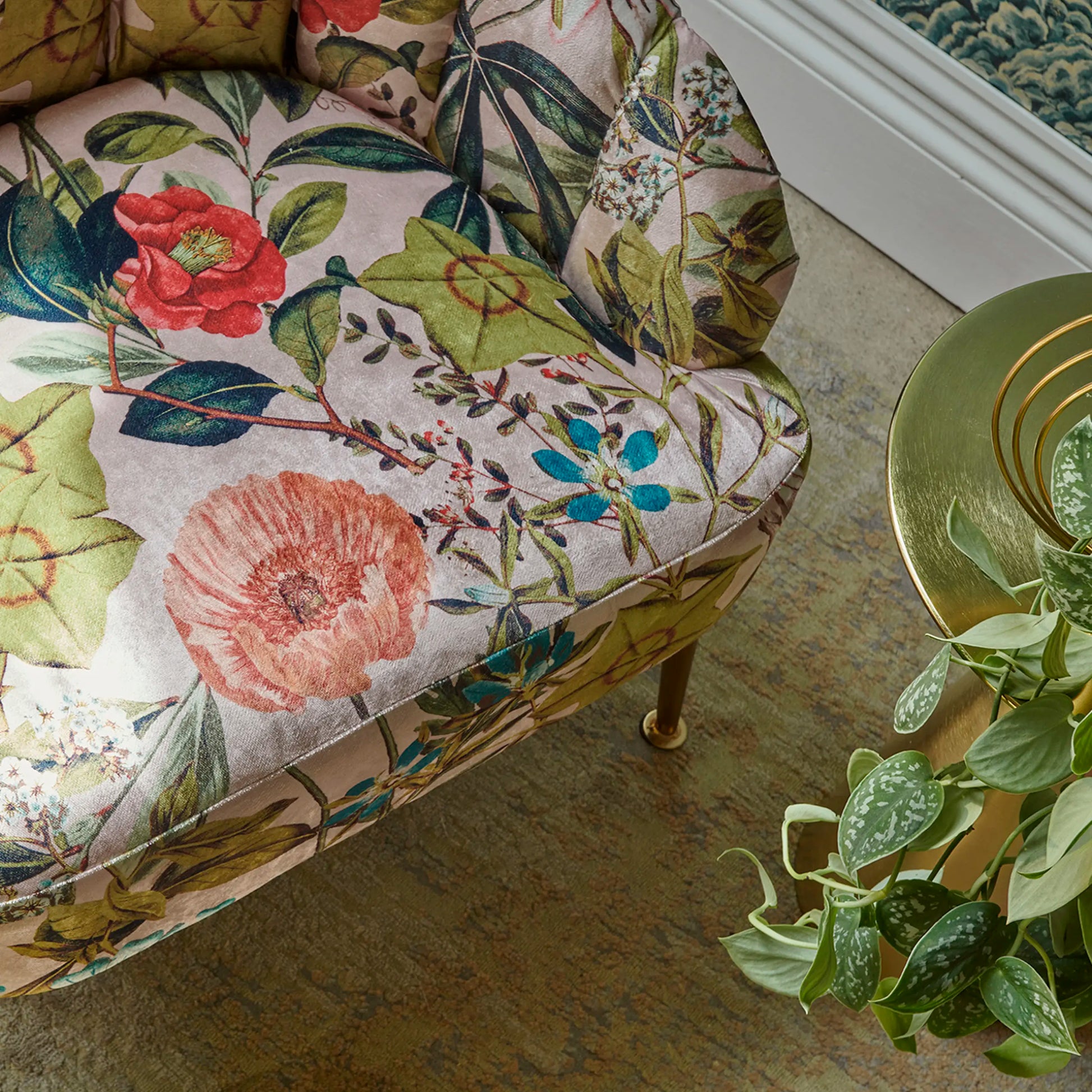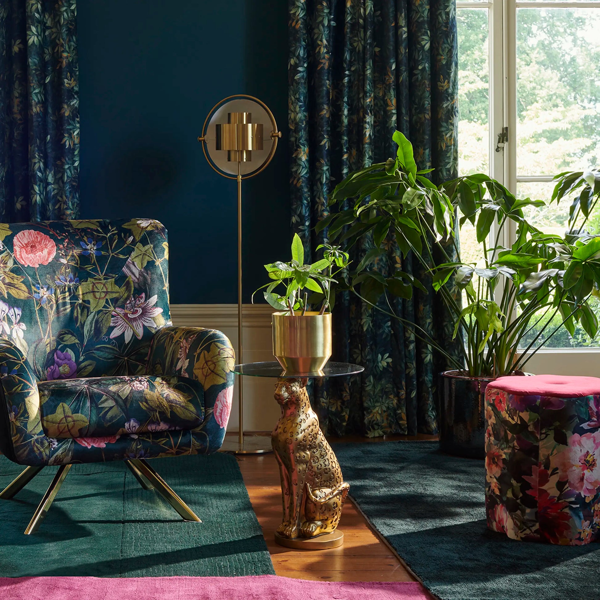 An iconic feature design for Clarke & Clarke from the first Exotica collection, passionflowers in a trail come to life with new vibrant, jewel colours on a luxe velvet. A popular choice, it's not hard to see why with the sheen of the velvet adding a regal quality to the print in all colour options.