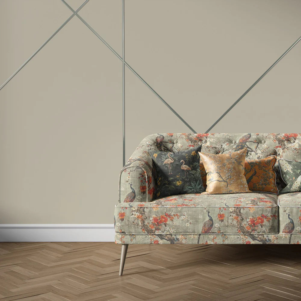 Bring the majesty of nature into your space with Pavone Upholstery Fabric No.1 – a bold, expressive design that centres on detailed peacocks nestled among painterly branches of white blossom and red florals. The colour palette evokes a warm, antique mood with soft sage, rich amber, and ivory tones woven together across a high-performance cloth.