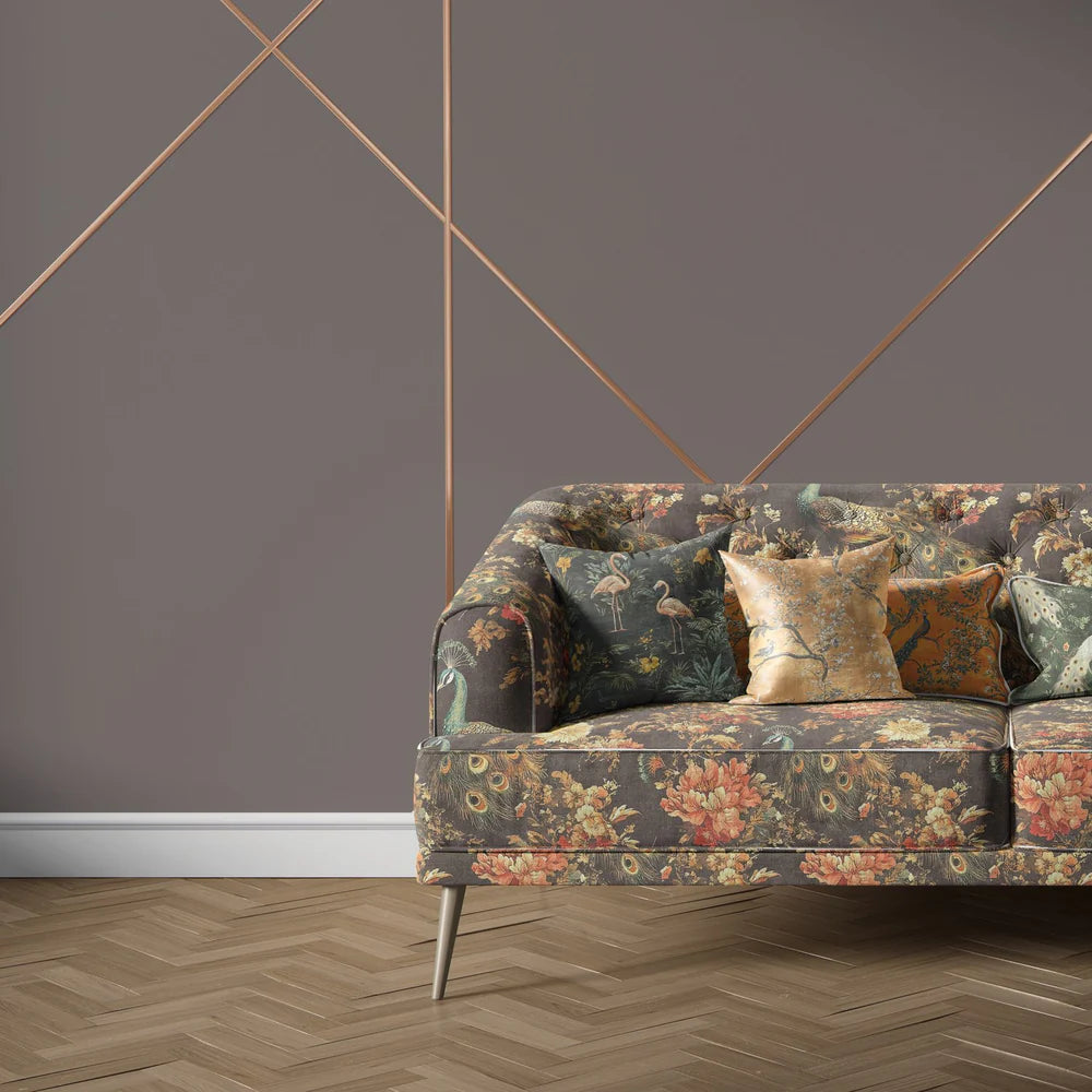 Pavone No.10 blends vintage opulence with a bold, painterly hand. Featuring a majestic peacock surrounded by warm ochre and terracotta floral blooms, this expressive bird upholstery fabric evokes the atmosphere of a grand conservatory or moody salon. Printed on a textured natural basecloth, it offers a richly layered aesthetic ideal for statement chairs, feature sofas, and characterful curtains.