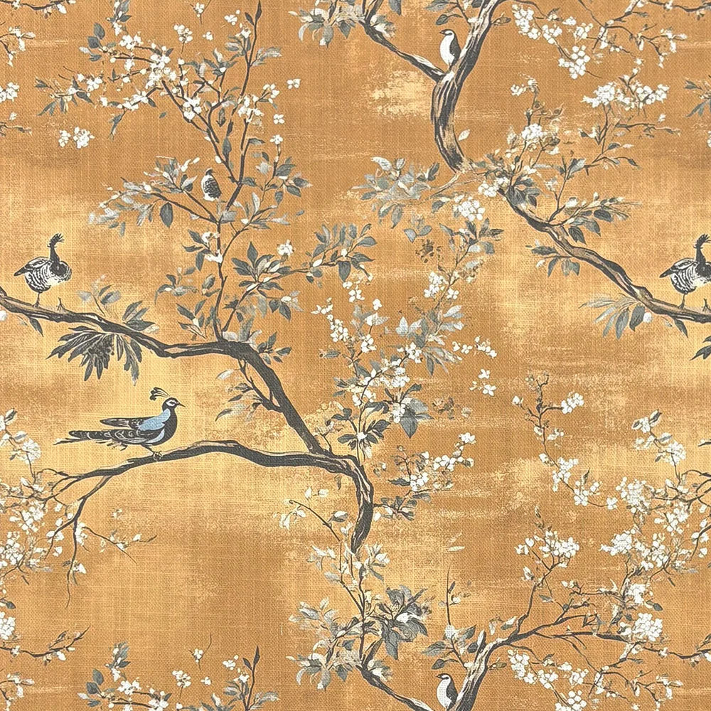 A golden ochre backdrop sets the scene in Pavone Upholstery Fabric No.3, where branches unfurl with delicate white blossom and perch curious painted birds. This design balances storytelling and elegance, evoking the charm of chinoiserie with a modern sensibility. The vibrant ochre tone adds warmth and energy, making this fabric an inspired choice for statement upholstery, vibrant armchairs, or cushions layered into maximalist interiors.