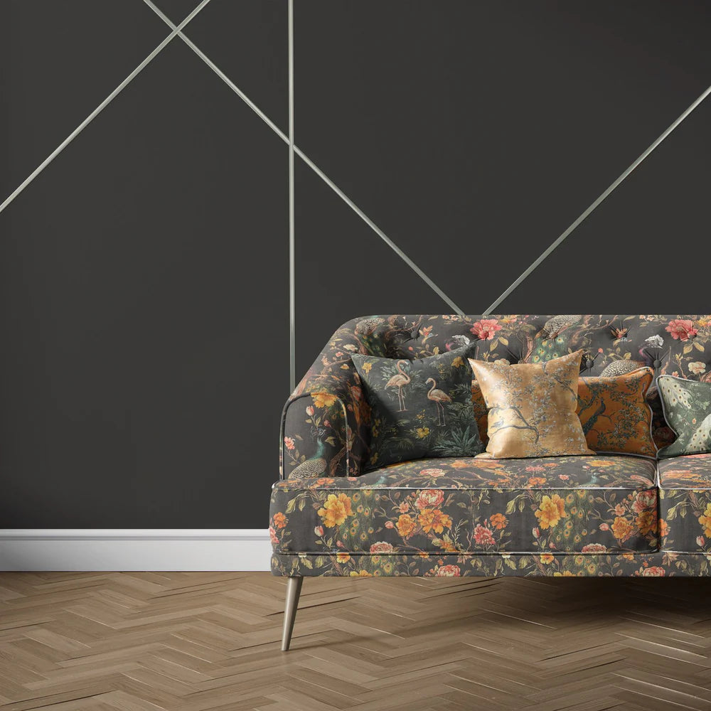 Pavone No.6 is a captivating bird upholstery fabric inspired by classic chinoiserie compositions and the opulence of historic wallcoverings. Its lush display of golden yellow and coral florals provides a vivid backdrop for the elegantly rendered peacocks, each perched in poised harmony amongst branches and blossoms. The deep charcoal ground enriches the layered detailing and lends sophistication to this bold statement piece.