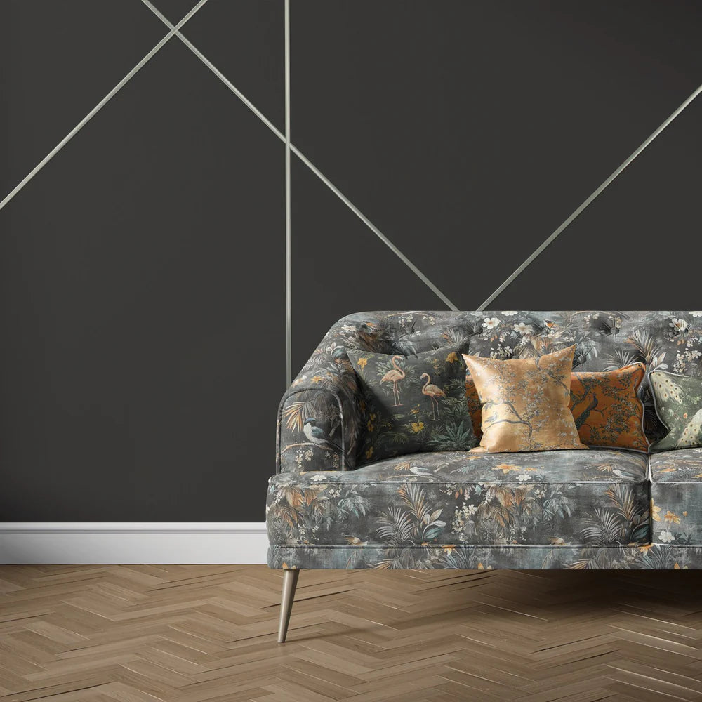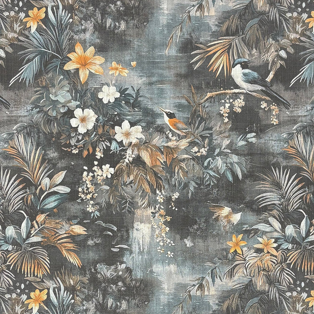 Bring natural grandeur to your interiors with Pavone Upholstery Fabric No.7—a richly detailed design capturing the essence of a lush tropical paradise. Featuring delicately illustrated birds perched among wild palms, golden lilies, and painterly foliage, this print brings a soft, dreamlike quality to any space. Shades of slate blue, amber, and muted sage evoke a dusky twilight palette, while the painterly texture adds an expressive layer to the design.