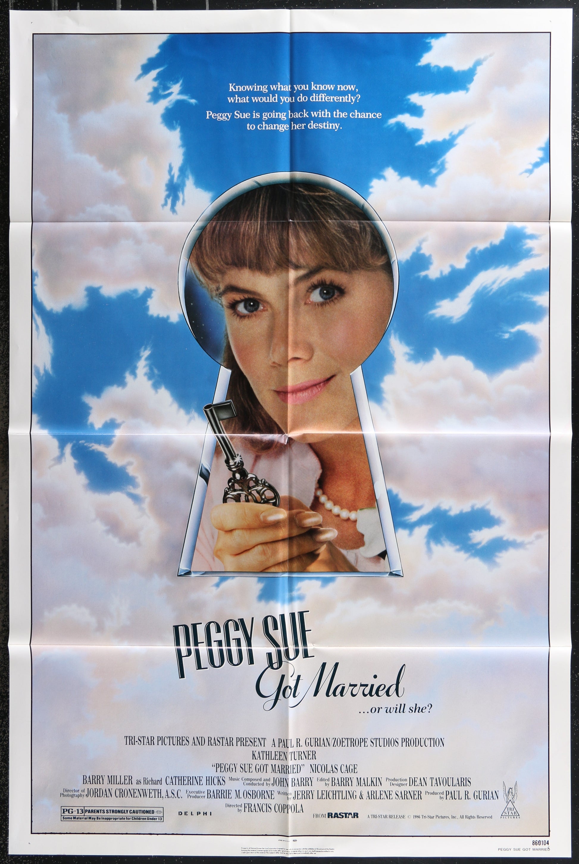 This Peggy Sue Got Married (1986) Original US One Sheet Movie Poster is an authentic, folded piece that measures 27" x 41" [69 x 104 cm]. The poster features the beloved Francis Ford Coppola time-travel romantic comedy starring Kathleen Turner and Nicolas Cage. There is minor wear on the edges and folds.