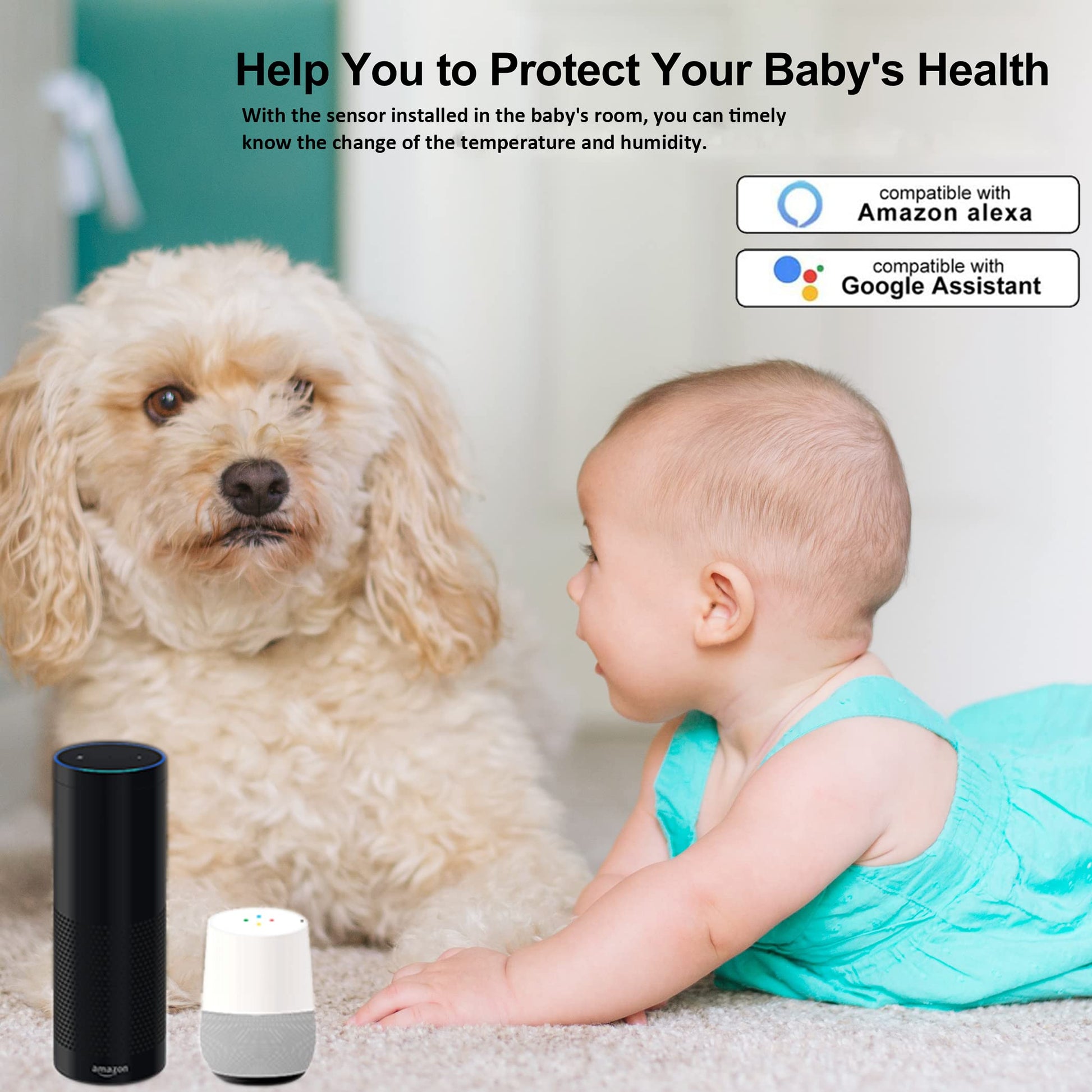 • Remotely View temperature humidity: The temperature and humidity sensor can be viewed remotely, you can monitor your baby's room, wine cellar, garage with this item. Support Alexa, and Google Assistant, know temperature via simple voice control commands, e.g.: "Alexa, What's the temperature in here"