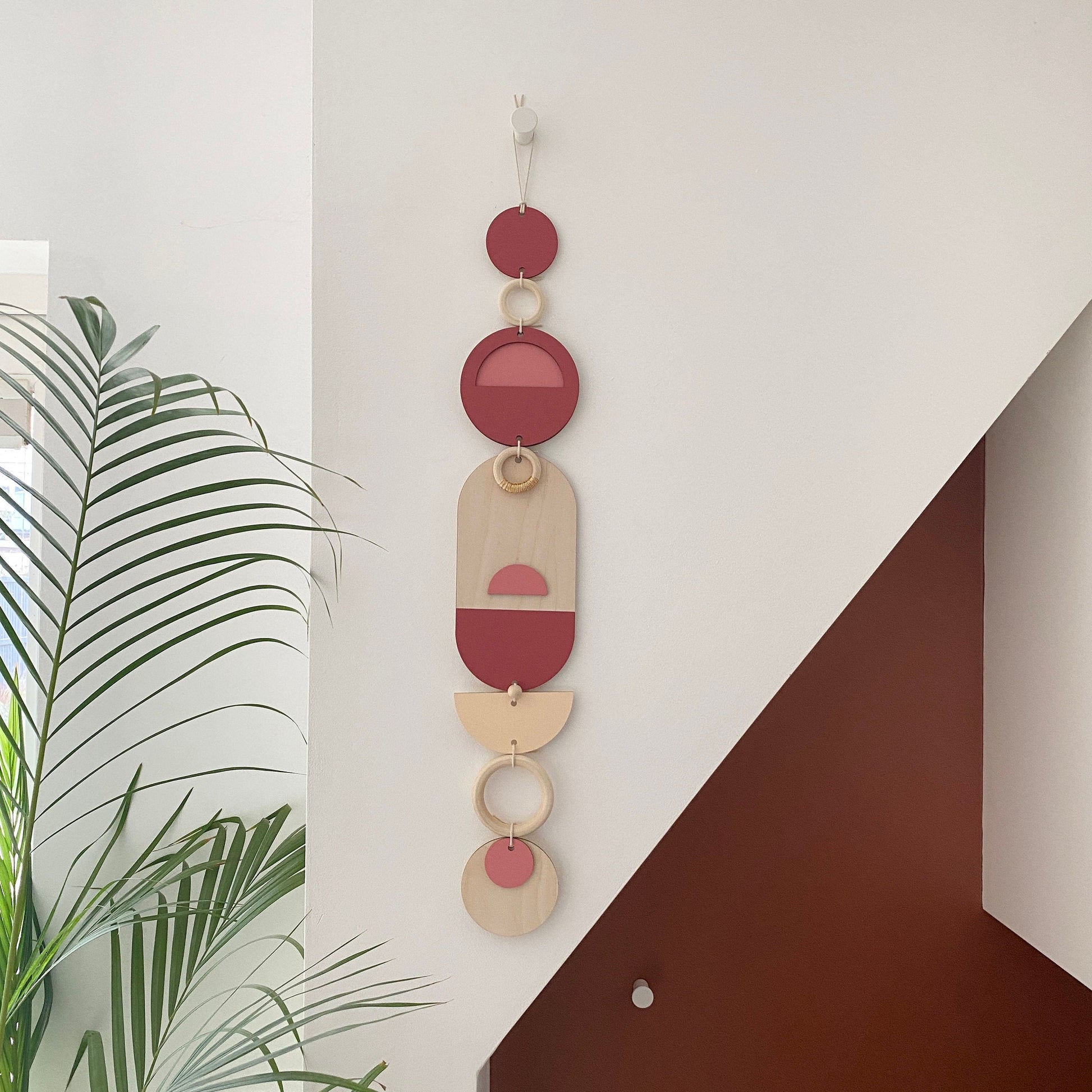 Lovingly handmade modern wall art. This Piece is made from plywood, paint, metal, waxed cord and wooden beads. The colours used are pinks and gold. This slim wall hanging would make a beautiful addition to any room to create a modern mid-century feel. Made from sustainable plywood, hand painted and constructed in Milton Keynes, England.
