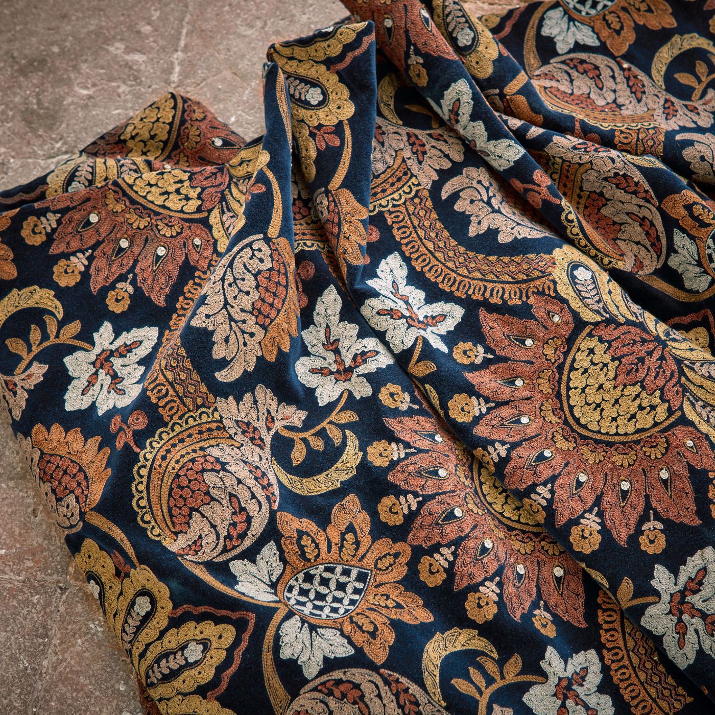 Beautifully embroidered on a fine cotton velvet base, this new interpretation of an iconic Zoffany damask displays a handsome, bold pattern. Originally designed in the mid 18th century, its chain and ari stitch detail add a real sense of luxury.