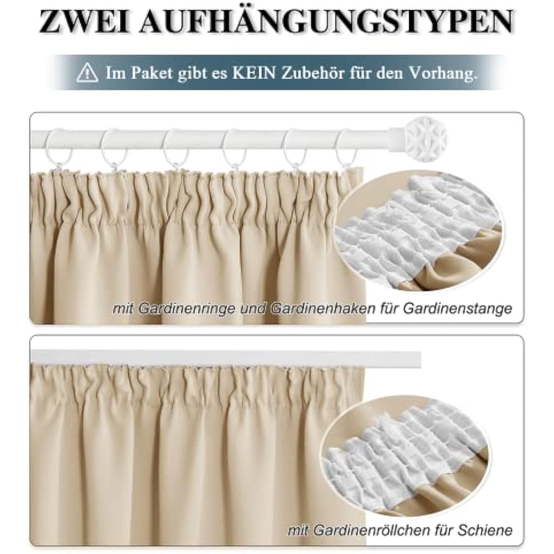 • Easy Installation - There are two methods for hanging: 1. Hanging with curtain rings and hooks on the curtain pole. 2. Hanging with curtain hooks on the curtain track. Suitable for curtain pole and curtain track rail.
