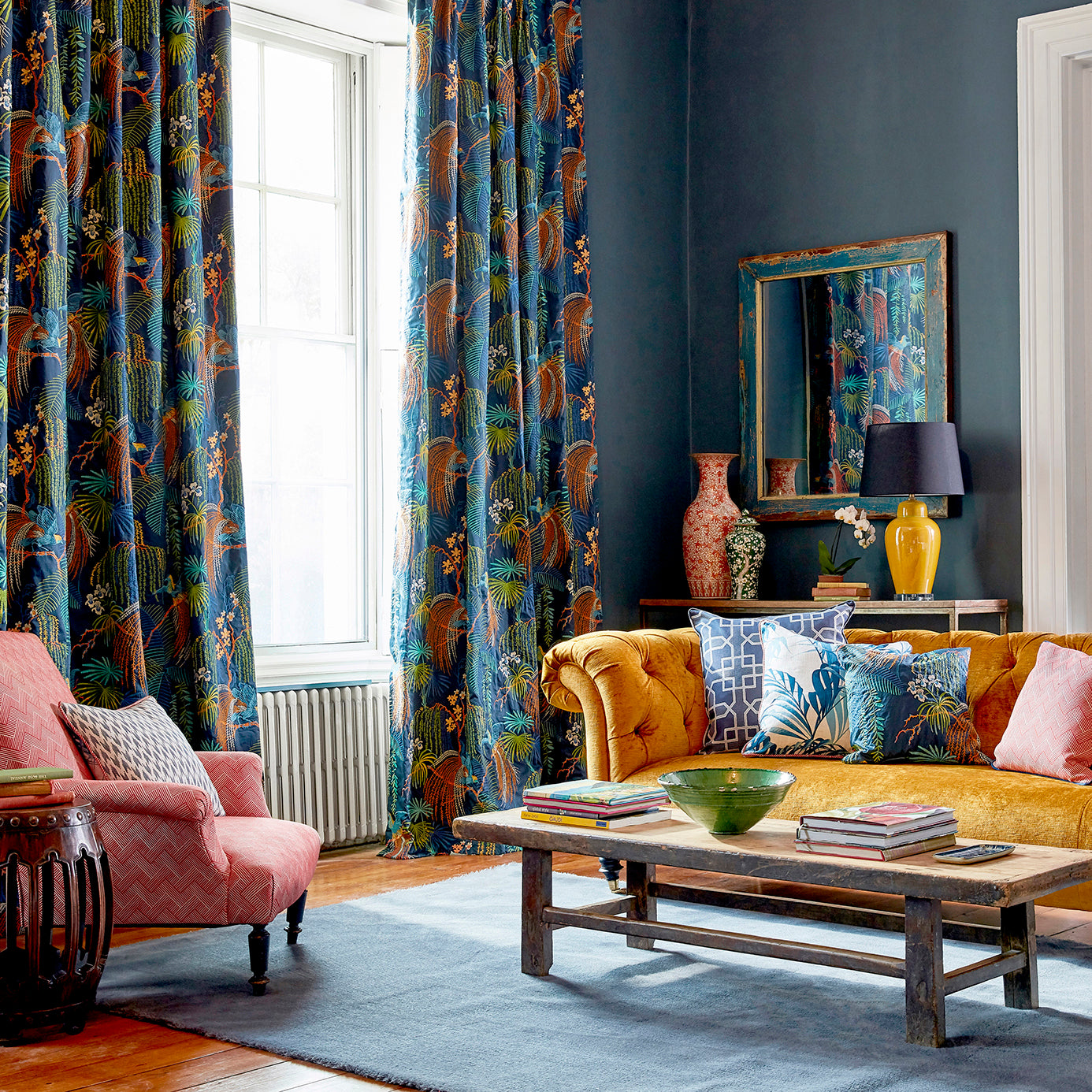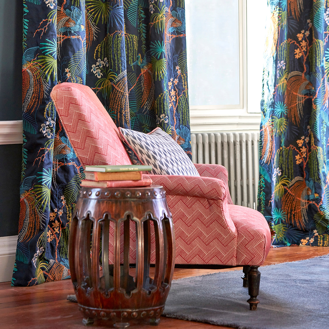 An exciting discovery from the Sanderson archive (drawn by F.M.Barnett c.1961), this intricate design was immediately adopted and translated into this stunning embroidery with its bright array of tropical colours adorning a choice of base cloths.