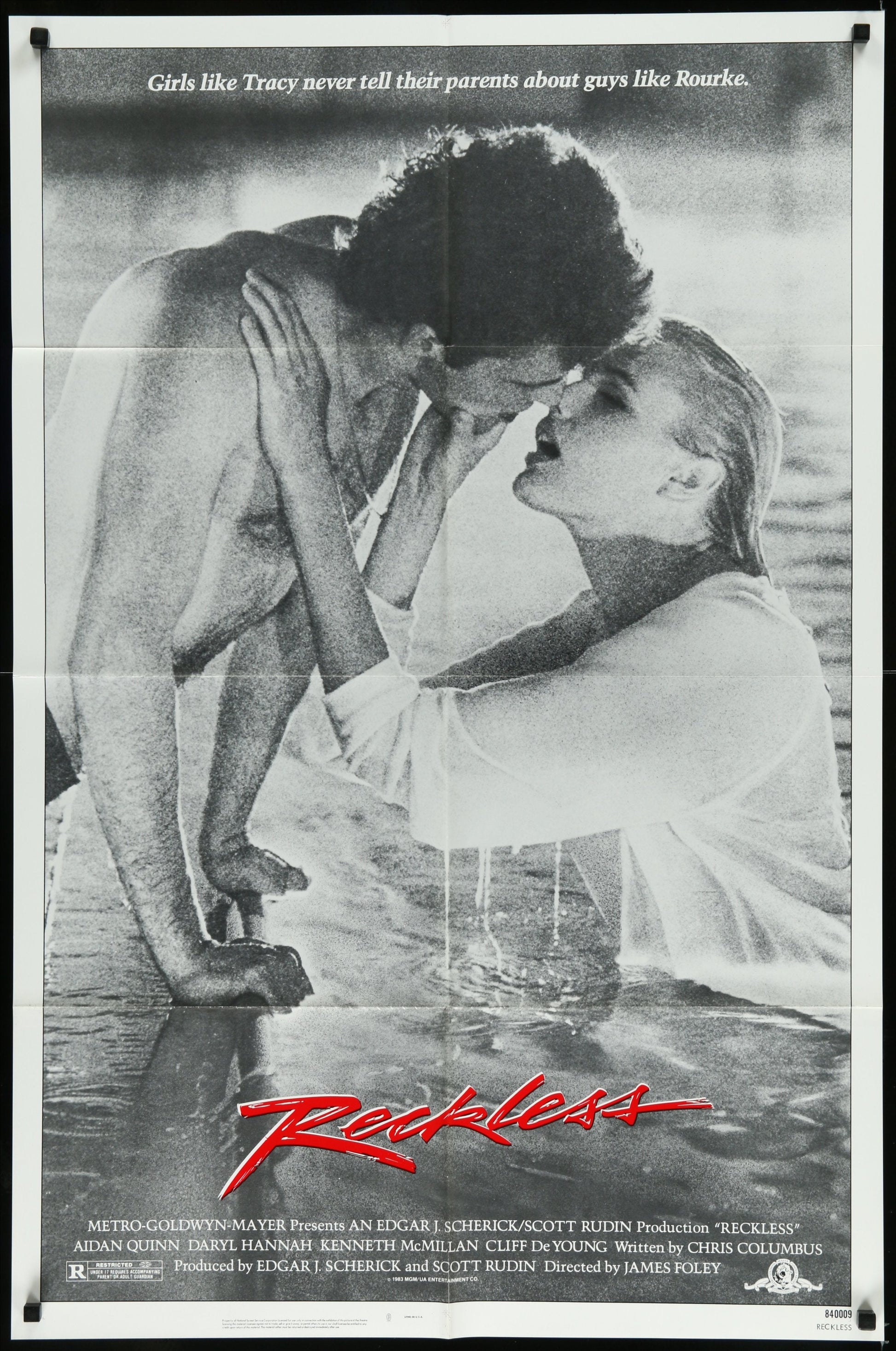 An authentic folded one-sheet movie poster for the 1984 romantic thriller Reckless, directed by James Foley and starring Aidan Quinn and Daryl Hannah, measuring 27" x 41" (69 x 104 cm). Shows edge and fold wear.