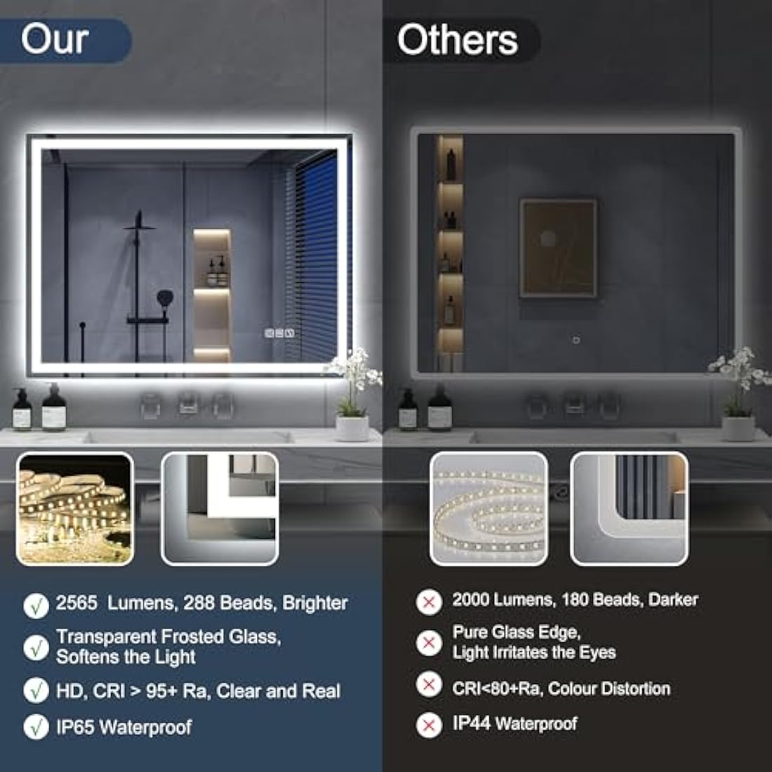 • ❤️【3x Explosion-Proof & IP65 Waterproof】S'bagno led mirror bathroom is made of 5mm tempered glass, 3 times harder than normal glass. It keeps the pieces stuck together even if accidentally broken, very safe. IP44 waterproof for the mirror and IP65 waterproof for the LED strip ensure lasting performance and mitigate rust and corrosion
