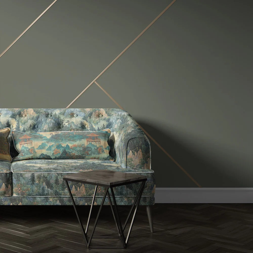 Let your interiors journey into a mythical landscape with Scenic Upholstery Fabric No.1 — a dramatic upholstery fabric inspired by ancient Eastern scroll paintings. This richly illustrated design features mountainous terrain, pine forests, waterfalls, and pagodas rendered in exquisite detail and a serene palette of jade greens, slate blues, and soft ochre.