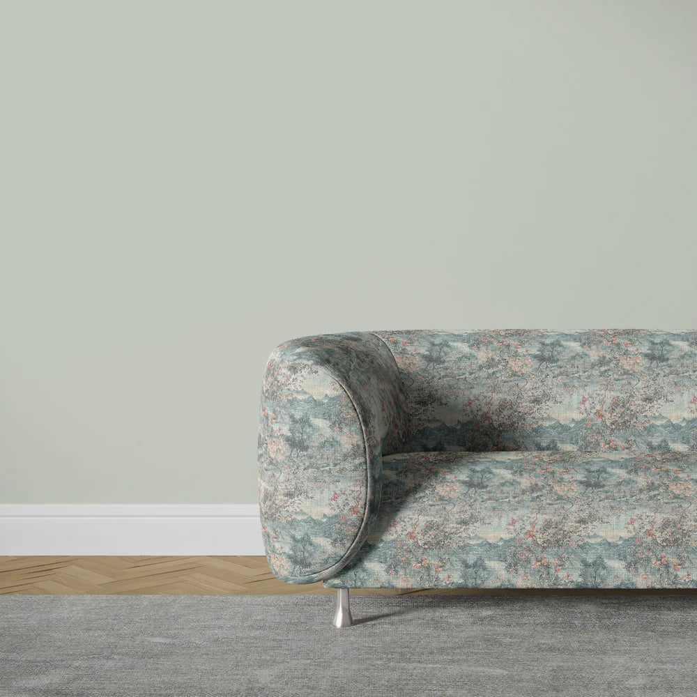 Scenic Upholstery Fabric No.11 captures the lyrical charm of a distant dream, where misty teal landscapes and delicate coral-blush florals unfold across a painterly composition. The design evokes a timeless sense of serenity—Chinese pavilions nestled among mountain ridges, blooming trees arching over peaceful gardens, and soft skies rising behind a distant range. This colourway uses a calming palette of muted teal, duck egg, and faded pink, creating a refined yet poetic aesthetic.