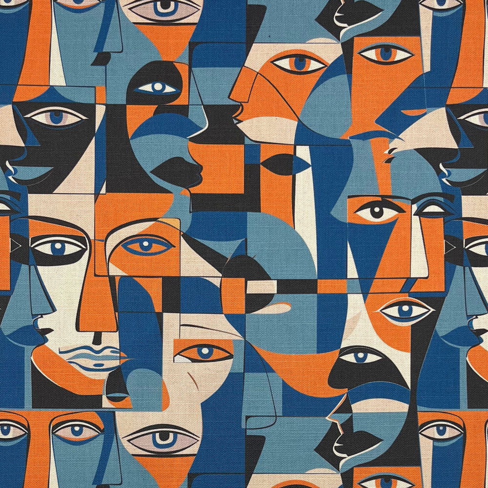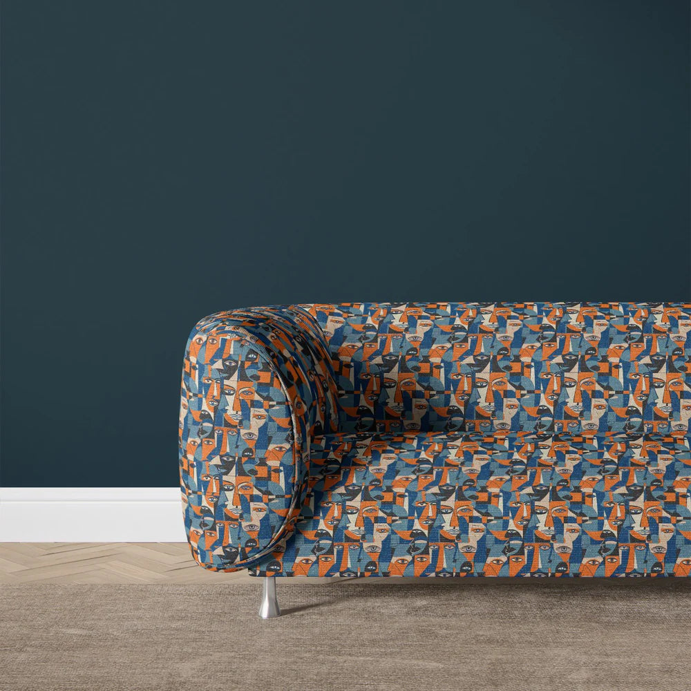 Sculpture Upholstery Fabric No.11 captures the energy of cubist portraiture in a bold blue and orange palette, layered with expressive brushstrokes and overlapping faces. Each fragment reveals a glimpse of an eye, a nose, a jawline — coming together in a visual rhythm that’s both structured and wildly creative. This design lends a contemporary art feel to any room, whether it’s used for chairs, sofas, or statement soft furnishings.