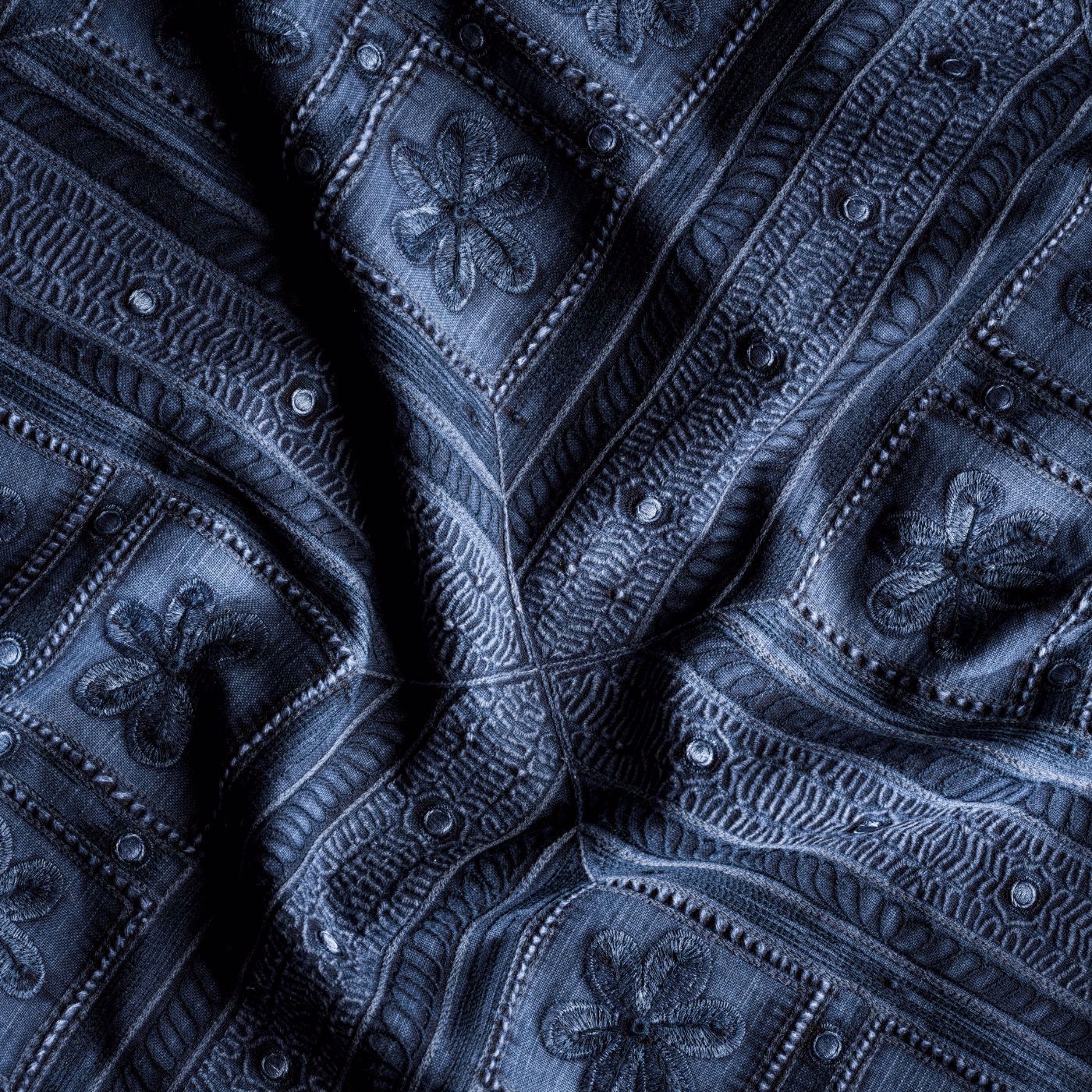 Shand Gate embroidery is named after the Shand Gate, the 18th-century Indian doors which form the entrance to the Cottage Garden at Highgrove. This fabric is created using a technique combining two global crafts: air knife printing and embroidery, highlighting the markings and patterns of the jubilant gates.