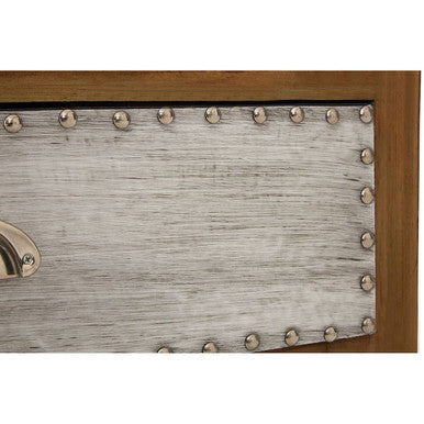 The frame is made from durable MDF, with fir wood legs, ensuring a robust table, while the wooden grain adds rustic charm. Two equal sized drawers feature a decorative aluminium sheet finish. The table has ample space for keeping magazines and other items close to hand.