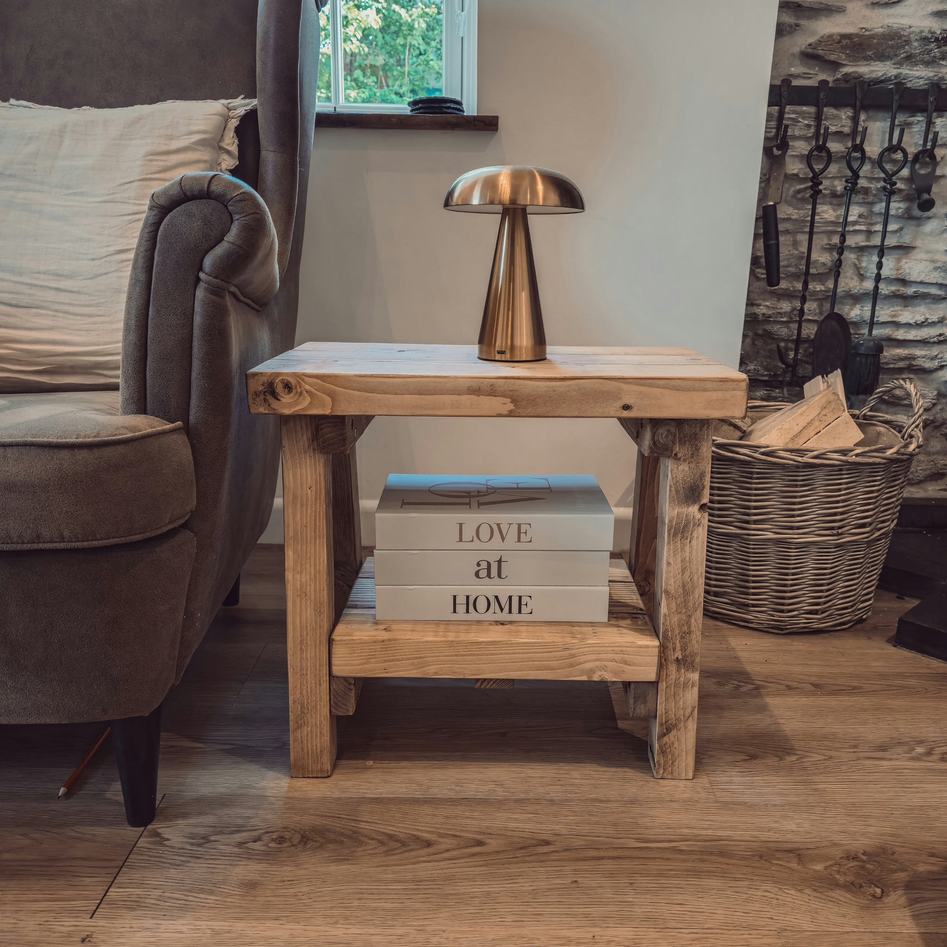 The pictured table is L50xW28xH40 cm high and dark oak wax finish.