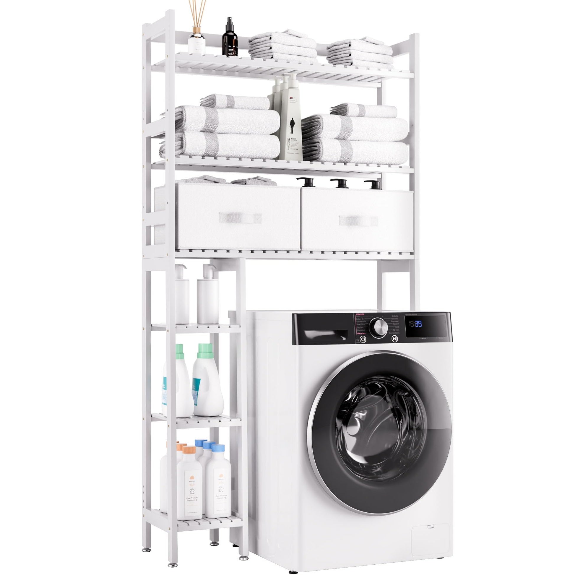 SMIBUY Over The Toilet Storage with Drawers, Large Bathroom Space Saver Organizer Rack, Freestanding Behind Toilet Stand with 6-Tier Shelf and Waterproof Feet Pad for Restroom, Laundry (White)