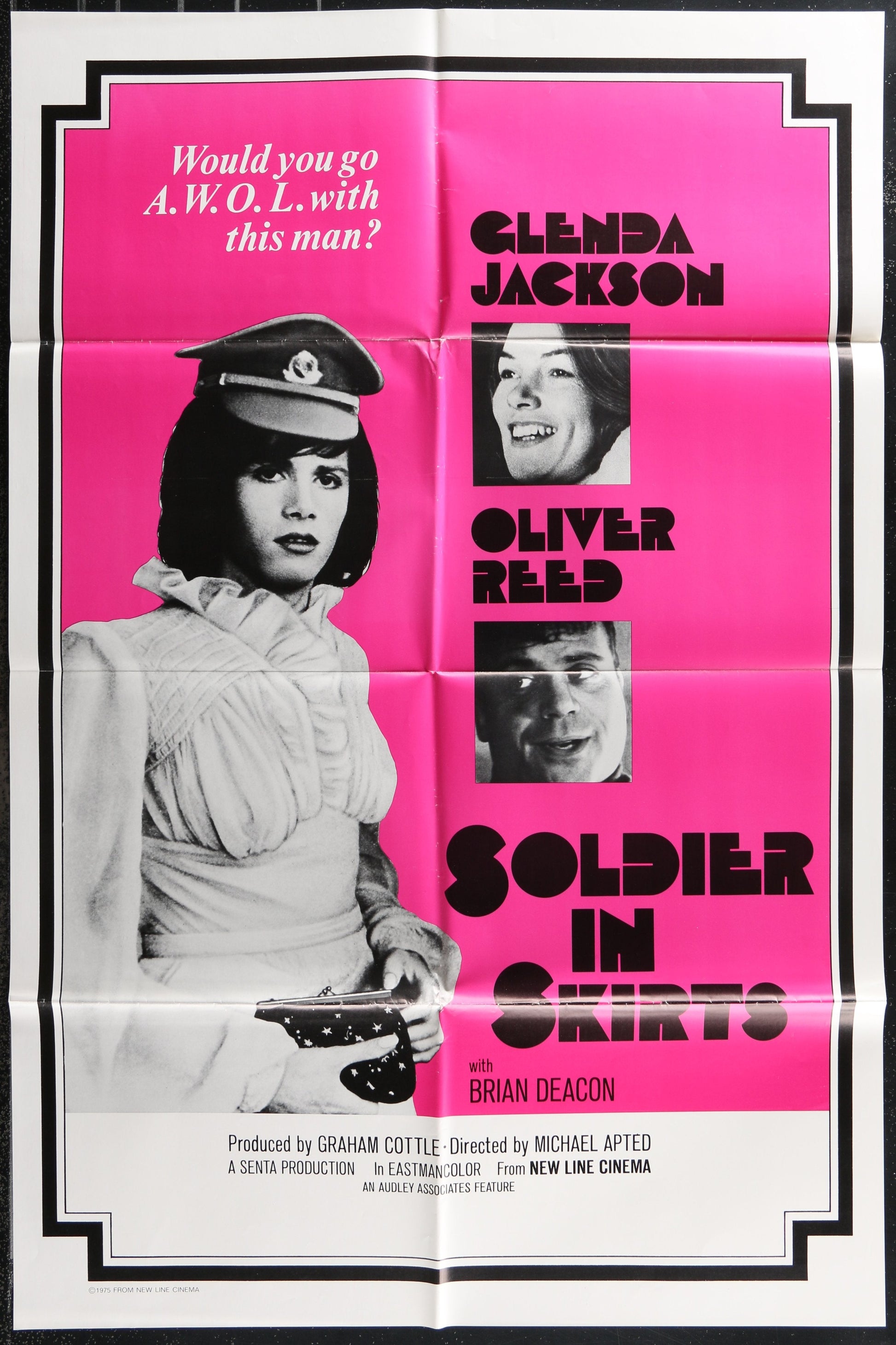 The Soldier In Skirts (1975 RR) Original US One Sheet Movie Poster is a 27" x 41" [69 x 104 cm] re-release folded poster, featuring the Michael Apted-directed cross-dressing military drama starring Glenda Jackson and Oliver Reed. The edges and folds exhibit some wear, with minor creasing and scuffing on the folds.