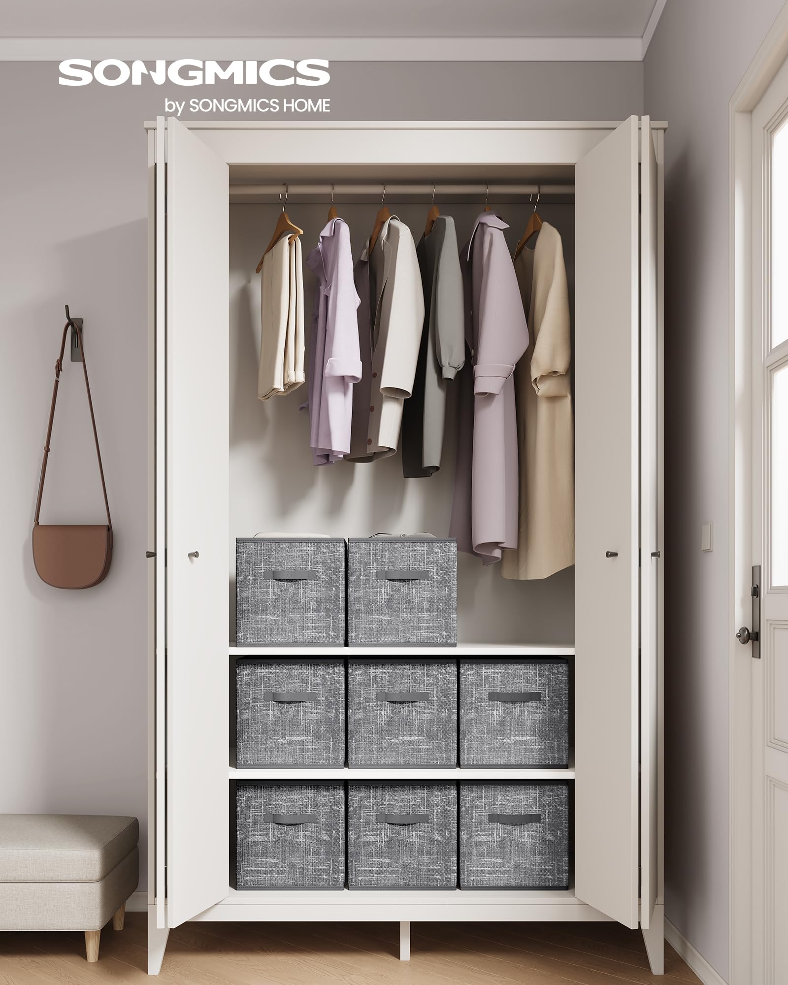 SONGMICS Storage Cubes, 33 cm Non-Woven Fabric Bins with Double Handles, Set of 8, Wardrobe Organisers for Shelves, Foldable, for Clothes, Cattail Grey ROB833G01