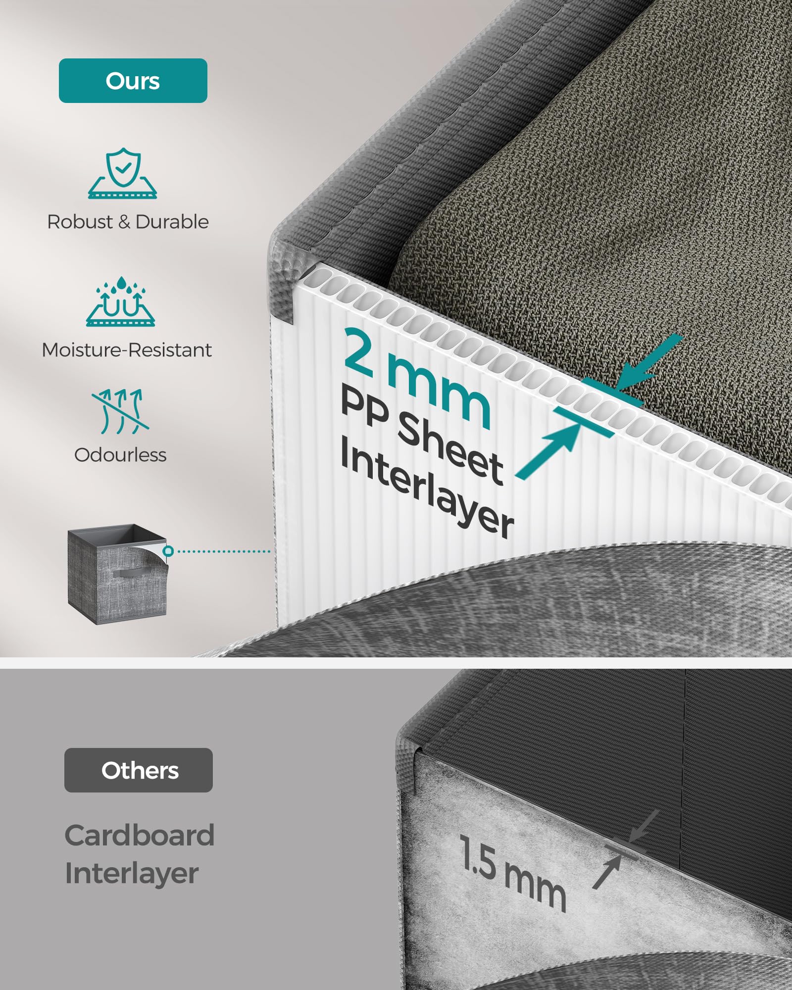 【DURABLE AND STABLE】Crafted from 80 g/m² non-woven fabric and odourless PP plastic sheets, each box with 2 handles can hold up to 5 kg, making them perfect for securely storing a variety of items