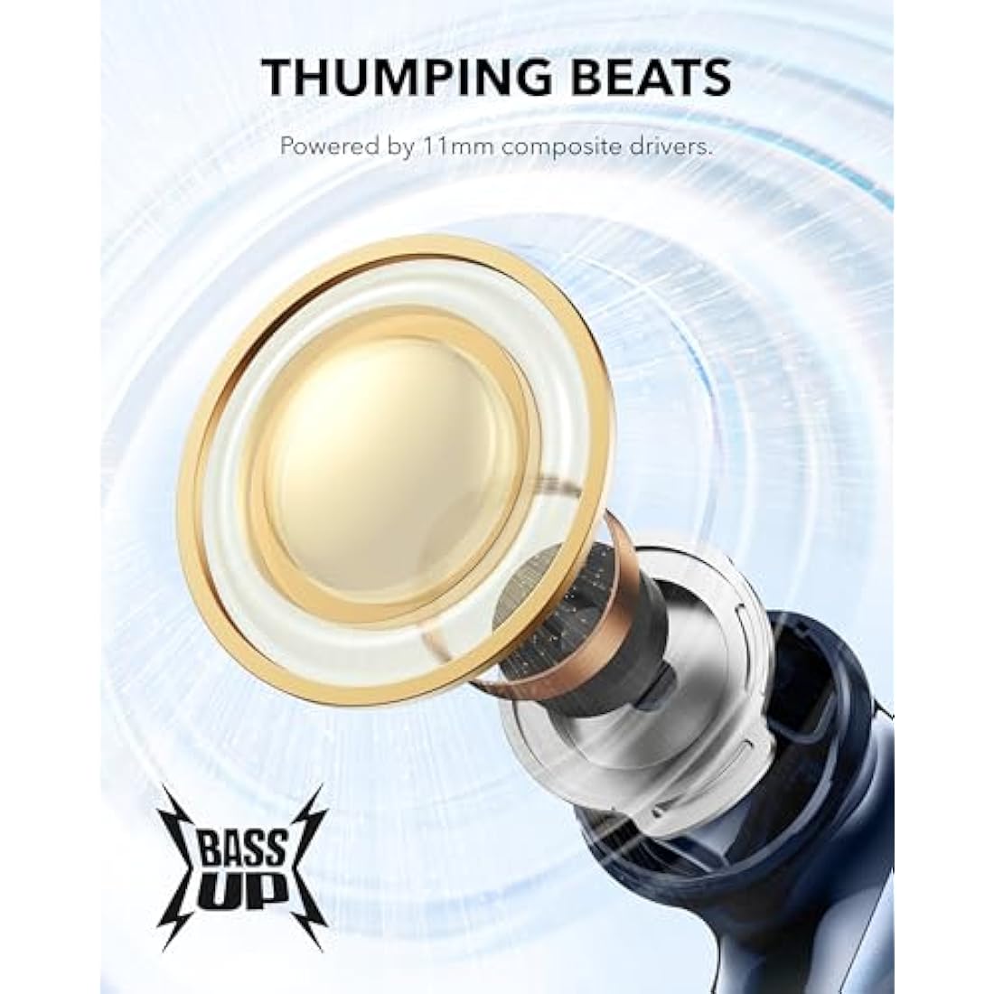 • [Thumping Beats]: soundcore P40i wireless earbuds feature 11mm composite drivers for an intensive audio experience, enhanced with BassUp technology for real-time intense bass.