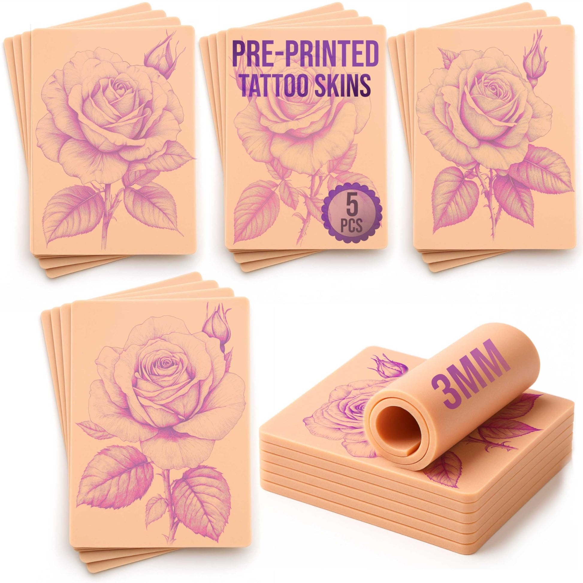 Stencil Skins Pre Printed Tattoo Practice Skin Set 5 Detailed Flower Designs, 3mm Silicone Tattoo Fake Skin, Perfect for Shading, Colour & Line Practice for Artists Realistic Rose