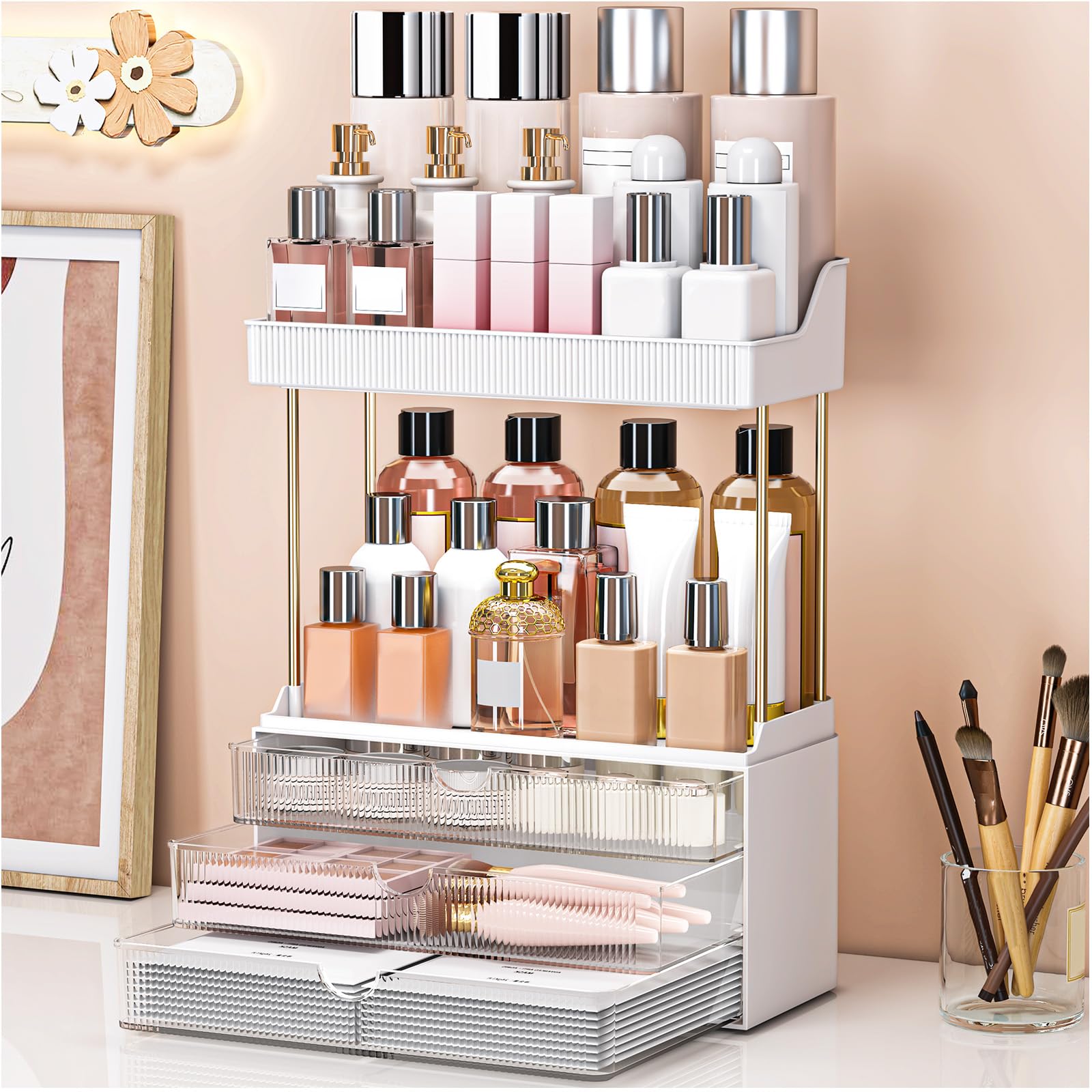 • Extra Large Capacity:This makeup organiser is designed with practicality in mind. Featuring three spacious drawers and two open compartments, it offers ample storage space to hold a variety of items such as skincare bottles, facial masks, lipsticks, perfumes, and other beauty essentials. Each drawer opens smoothly and allows you to easily access and organize your daily makeup products, helping you maintain a clean and clutter-free dressing table.