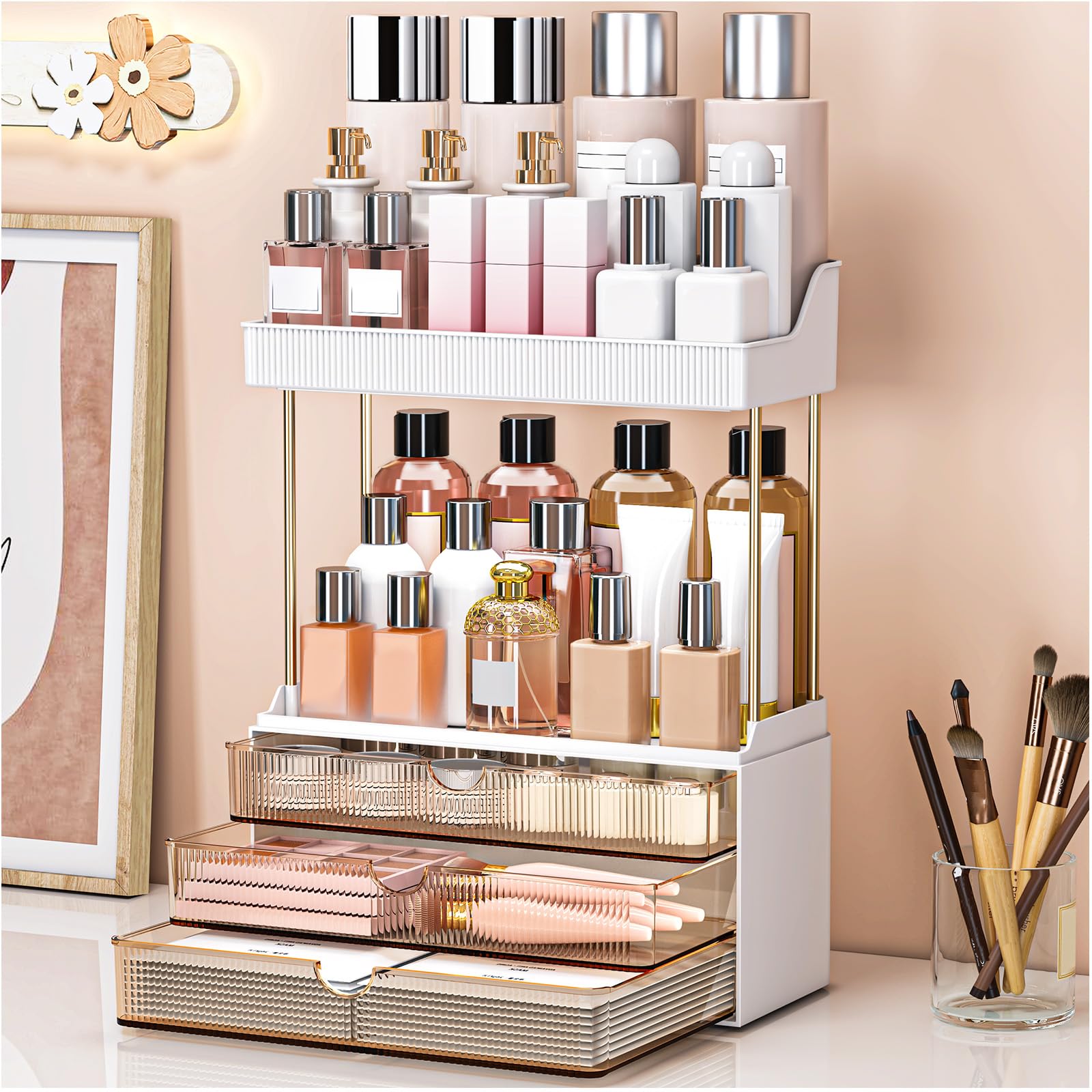 Storivo Makeup Organiser,3 Tier Drawer,Large Vanity Organiser, Multifunctional Organizers, Dressing Table Organiser, Makeup Brushes,Skincare, Perfume, Amber
