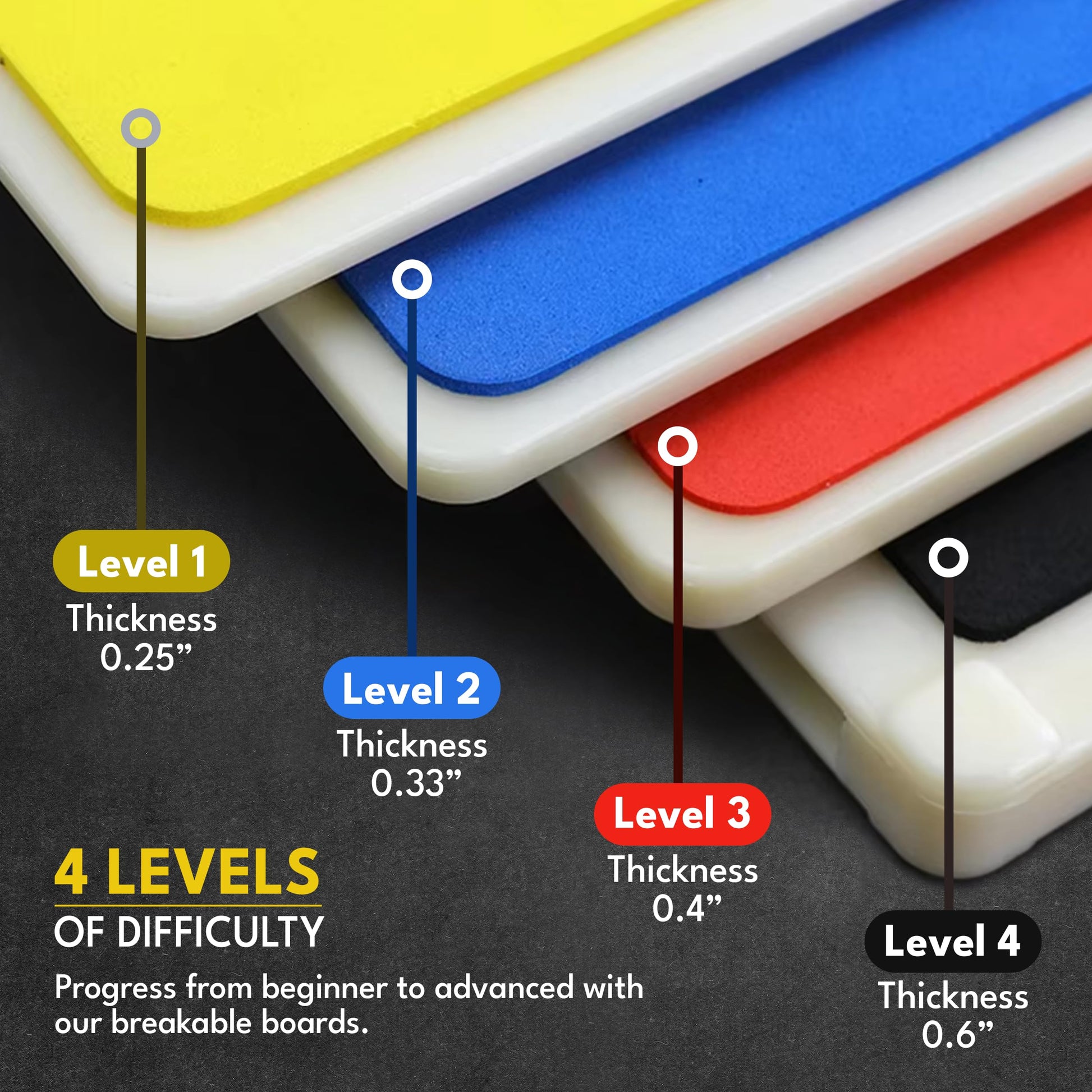 Level of Difficulties: Our selection includes four distinct difficulty levels, catering to all skill levels. Starting with the beginner-friendly yellow board and progressing to the black board challenge, these boards are ideal for honing your board-breaking skills in taekwondo and karate, and they're also a fantastic choice for children learning to break boards.