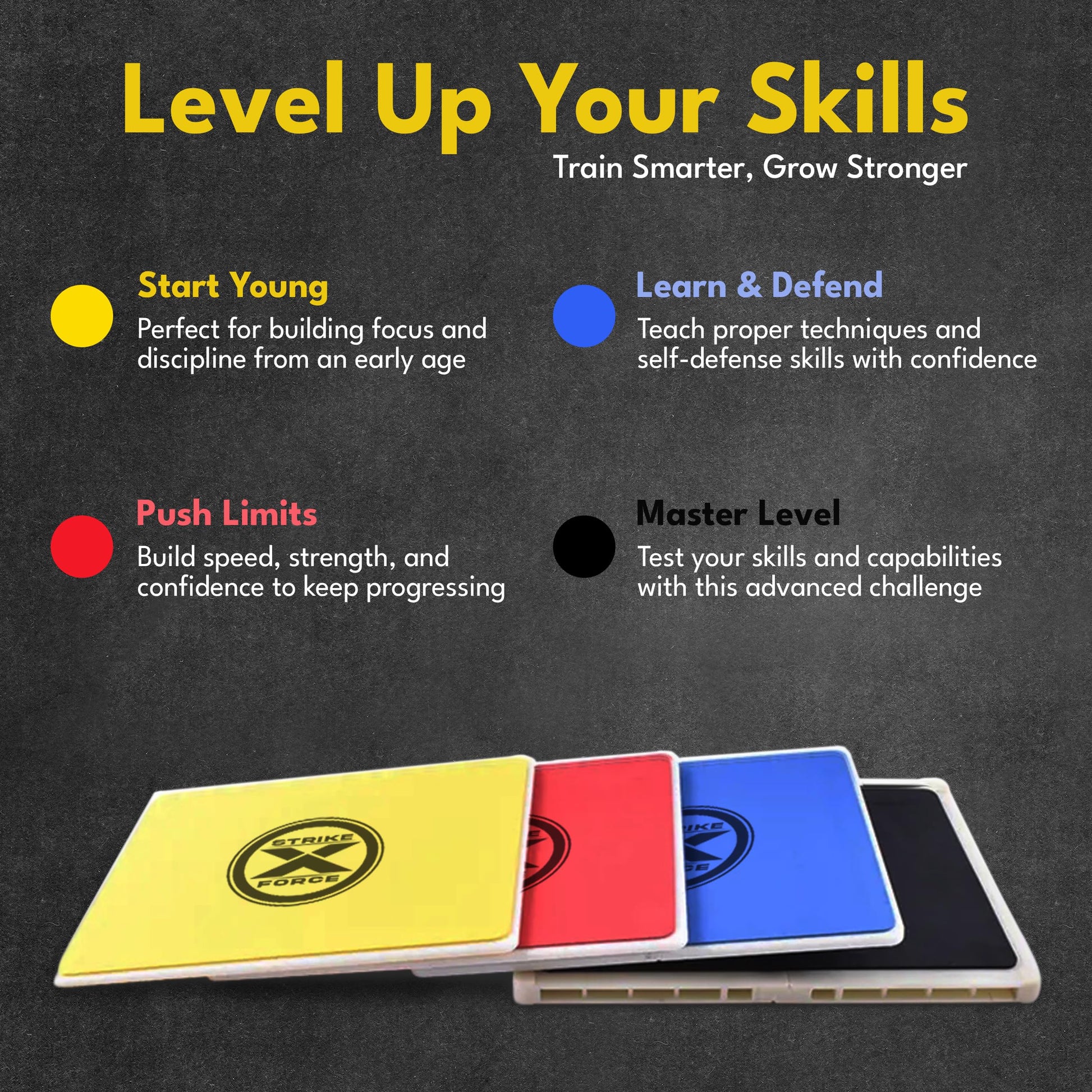 Features: We provide four different level of difficulties to choose from. The Yellow board is the easiest board to break. It is designed for young children looking to develop proper stance and perform basic moves. Learning technique on a breakable board (acting as resistance) from an early age will drastically increase speed and strength in the future!! We then increase in difficulty from Blue to Red and finally to Black. The boards are made of high impact molded plastic with durable rubber padding to provide support and avoid unnecessary knuckle injuries. Simple slide through formula to reassemble the boards again and again and (you guessed it) again!! Eco Friendly and budget efficient products. Substitute hundreds, and even thousands of wooden boards with only one of our durable rebreakable board. SAVE THE TREES!!!!