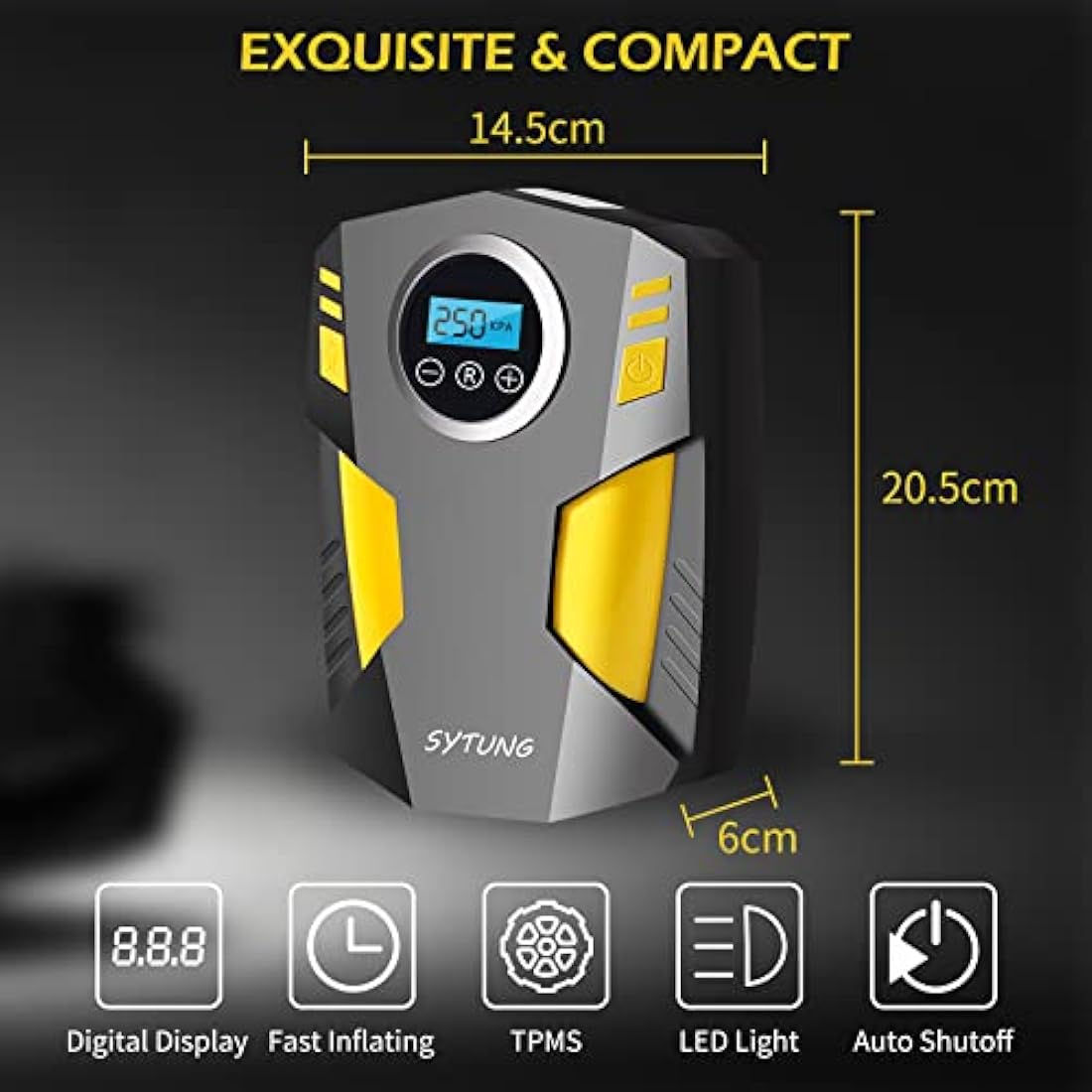 【AUTO SHUT-OFF】SYTUNG tyre inflator air compressor provides you with a safe usage experience thanks to its auto shut-off function. Set the desired pressure level and start the inflation process. When our car tyre inflator reaches the desired pressure, the car air compressor will automatically turn off, so you don't have to worry about over-inflating.