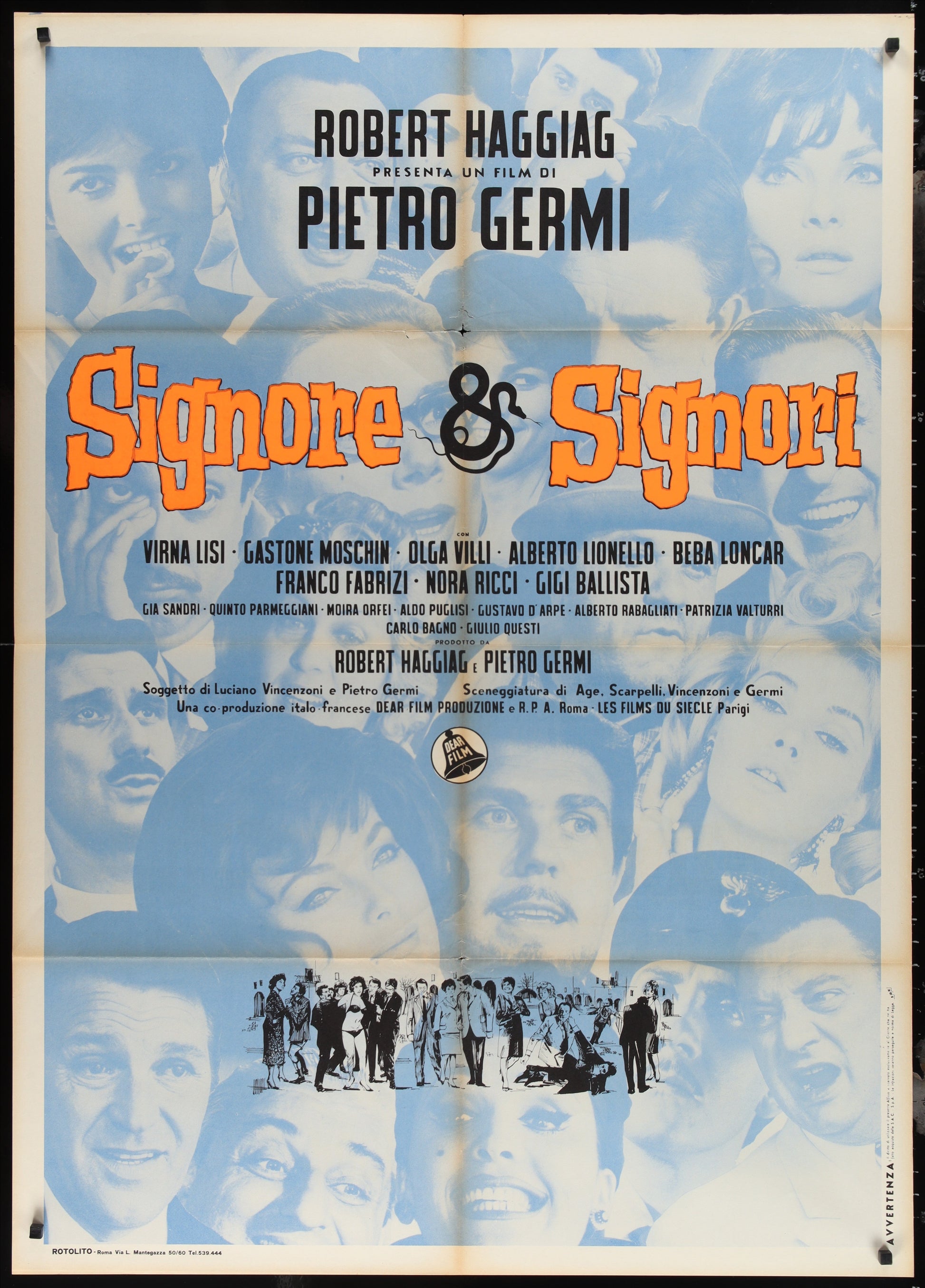 This poster is an original Italian one-panel movie poster for "The Birds, The Bees and The Italians" (1966), a romantic comedy directed by Pietro Germi and starring Virna Lisi and Gastone Moschin. Measuring at 39" x 55" (99 x 140 cm), it has tears and discoloration along the folds, as well as edge and fold wear.