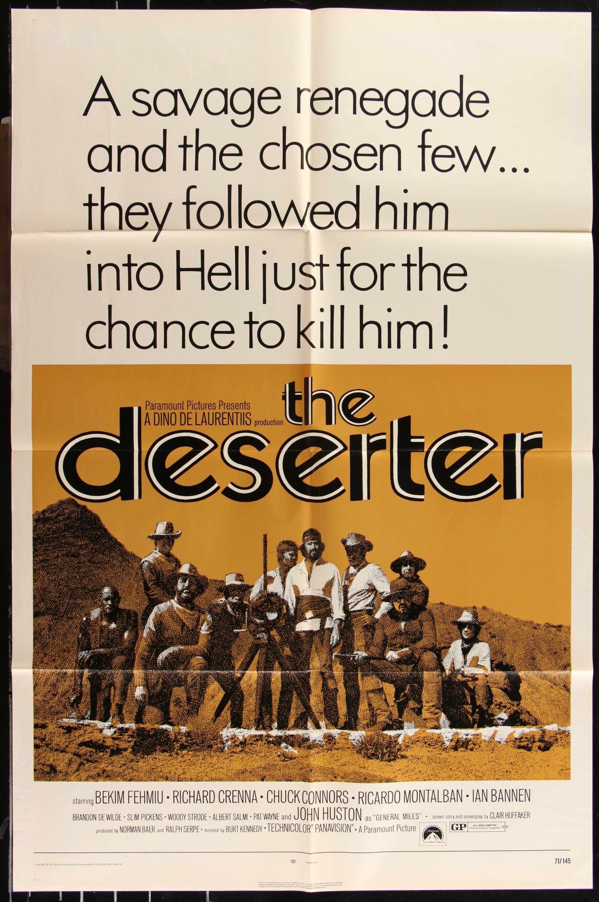 This is an Original, Folded One-Sheet Movie Poster for The Deserter, a spaghetti western from 1971 directed by Burt Kennedy and starring Bekim Fehmiu, Richard Crenna, and Chuck Connors. Measuring 27" x 41" (69 x 104 cm), this poster exhibits edge and fold wear.