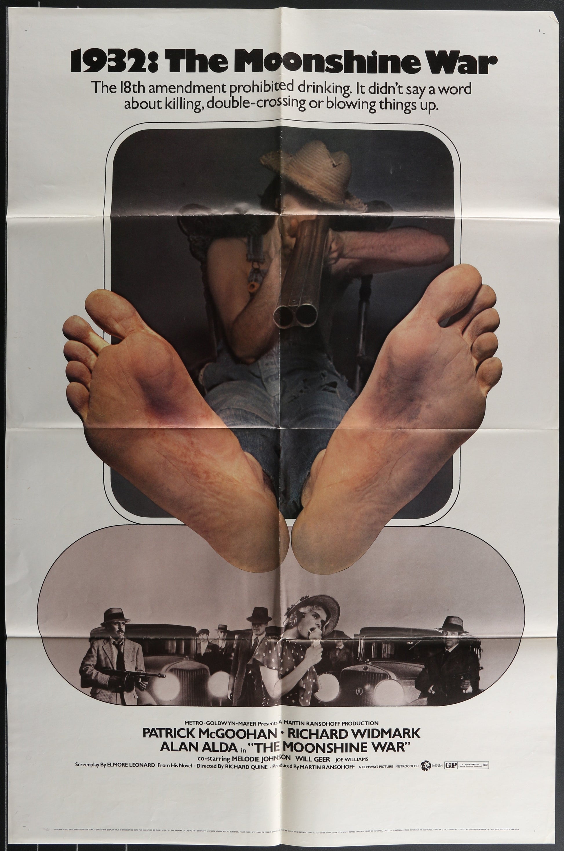 This is a 27" x 41" (69 x 104 cm) Original Folded One-Sheet Movie Poster for The Moonshine War, a 1970 film directed by Richard Quine. It features a star-studded cast including Patrick McGoohan, Richard Widmark, and Alan Alda in a thrilling bootlegging crime drama. The poster has some edge and fold wear as well as small markings.