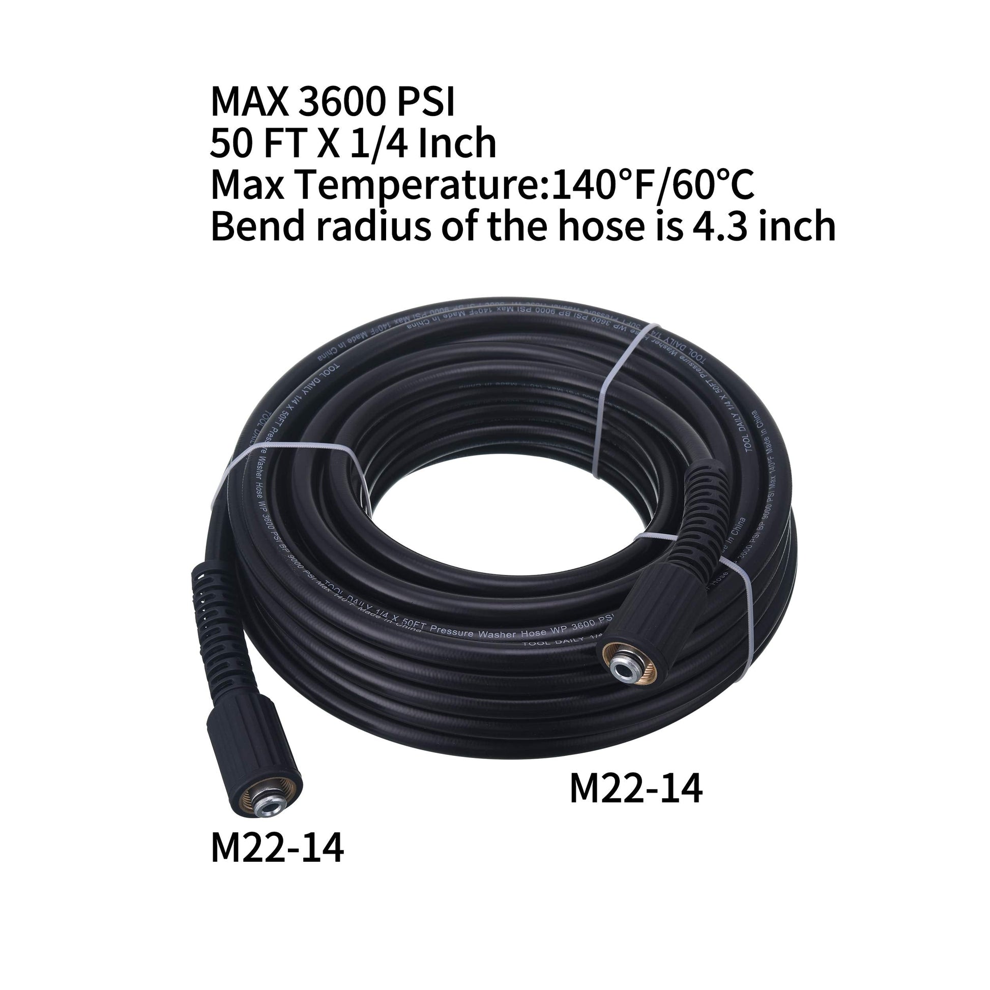 • Pressure washer hoses is 50 FT X 1/4 Inch. Bend radius of the hose is 4.3 inch. The working pressure is up to 3600 PSI. Max. Temperature: 140℉ / 60℃.