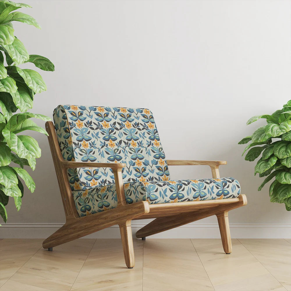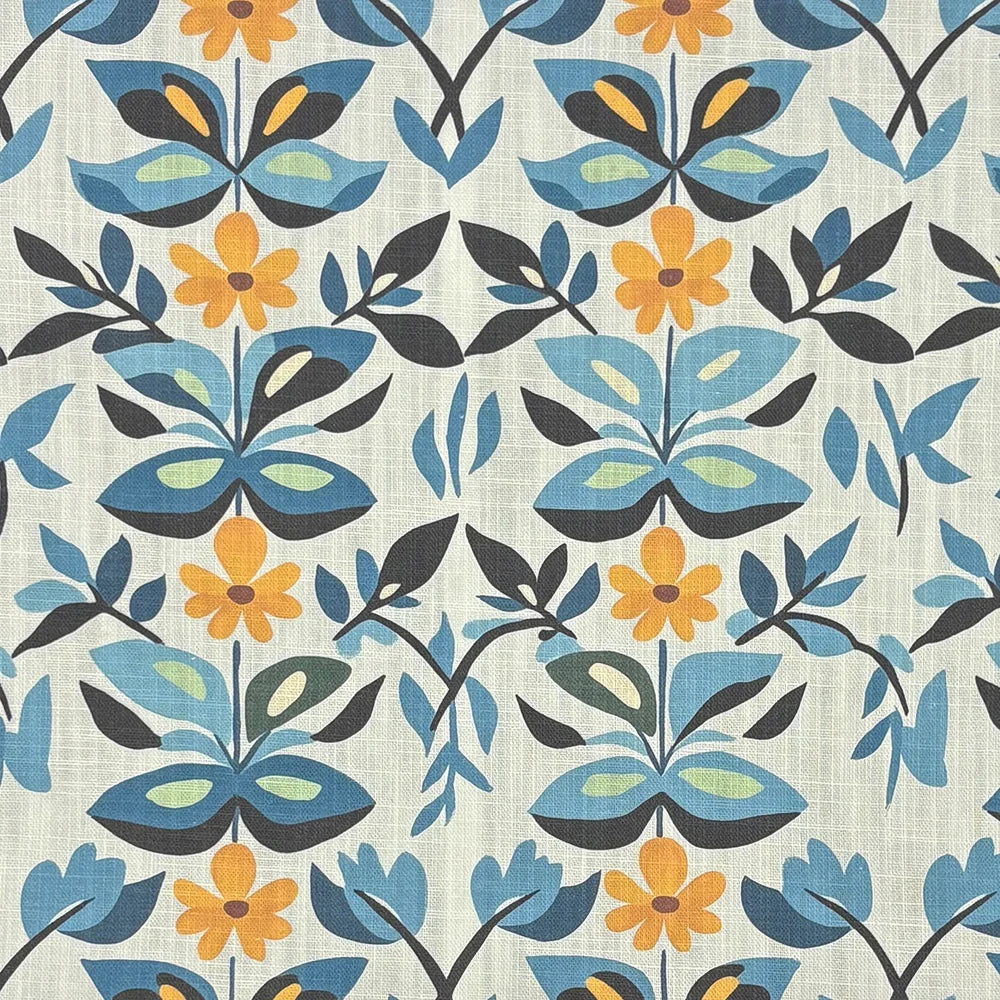 Playful, punchy, and unapologetically joyful, Tulpan Upholstery Fabric No.1 brings a Scandinavian sense of simplicity to your interiors. The floral pattern is clean-lined and confident, printed in rich blues, ochre, and charcoal on a natural base. The balance between symmetry and looseness in the repeat gives this design a rhythmic quality, perfect for contemporary or mid-century inspired spaces.