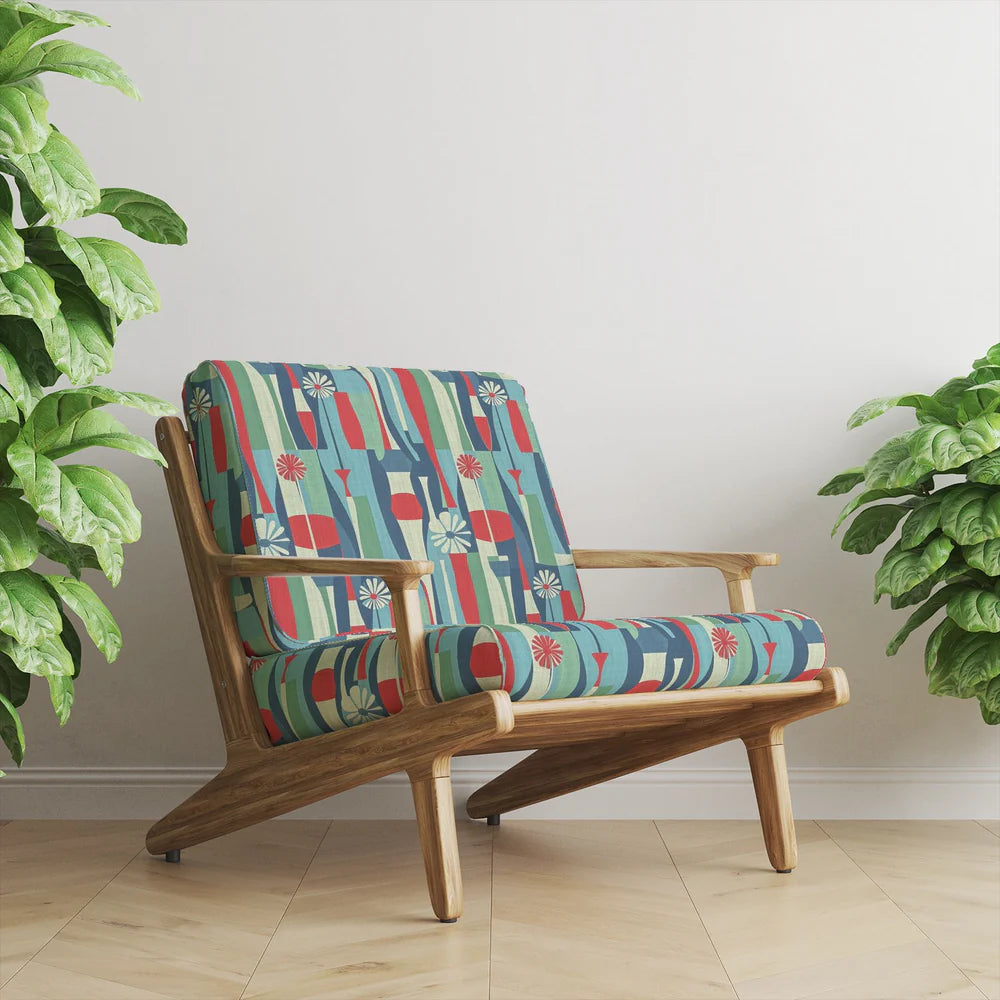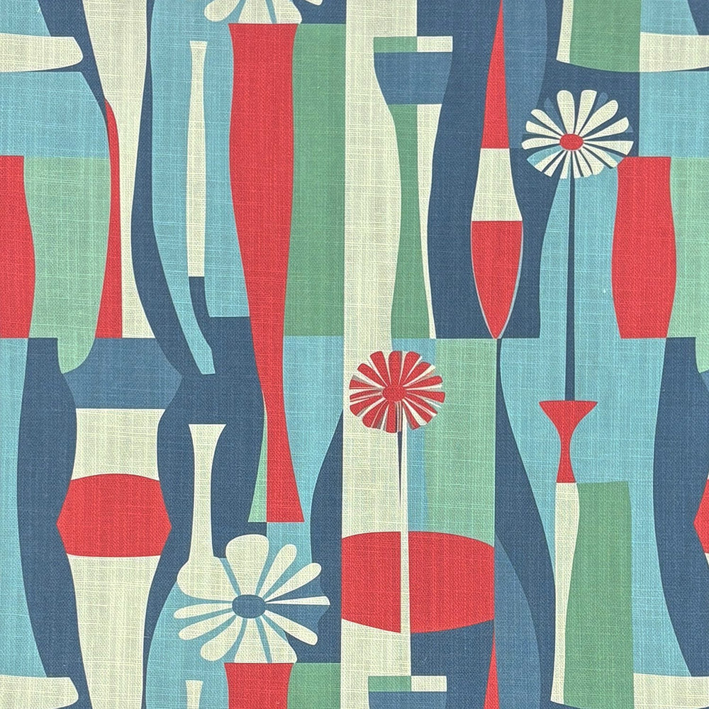 An uplifting, mid-century take on floral design, Tulpan Upholstery Fabric No.13 transforms everyday interiors into expressive, characterful spaces. This multicoloured design is printed onto our textured linen blend basecloth, featuring stylised daisy motifs set among tall, geometric vase forms. A palette of blue, red, green, and ivory brings the whole design to life with rhythm and clarity.