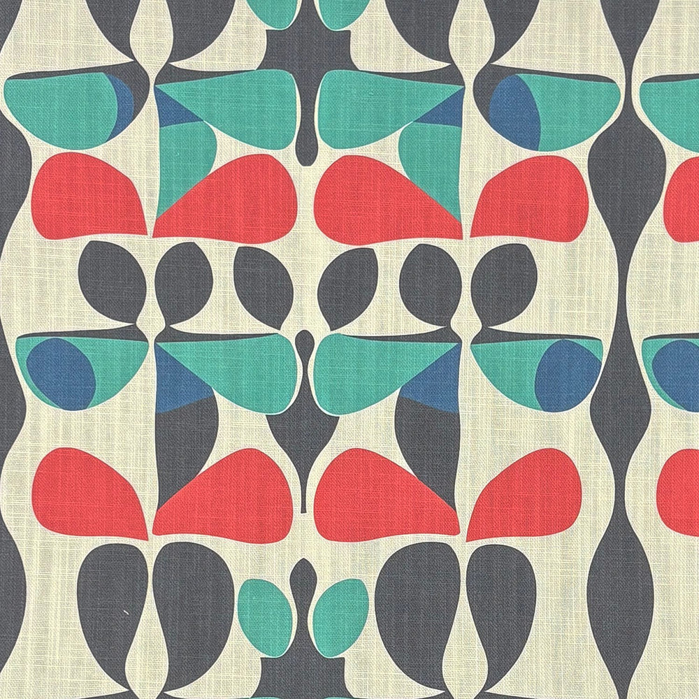 Tulpan No.15 is a vibrant mid-century upholstery fabric that draws inspiration from stylised tulip forms and abstracted botanical geometry. Printed in bold strokes of red, teal, navy, and charcoal on a soft natural background, this design invites rhythm, symmetry, and flair into your interior scheme. The repeated floral shapes echo both the stylisation of 1950s printmaking and the sculptural forms of modernist furniture.