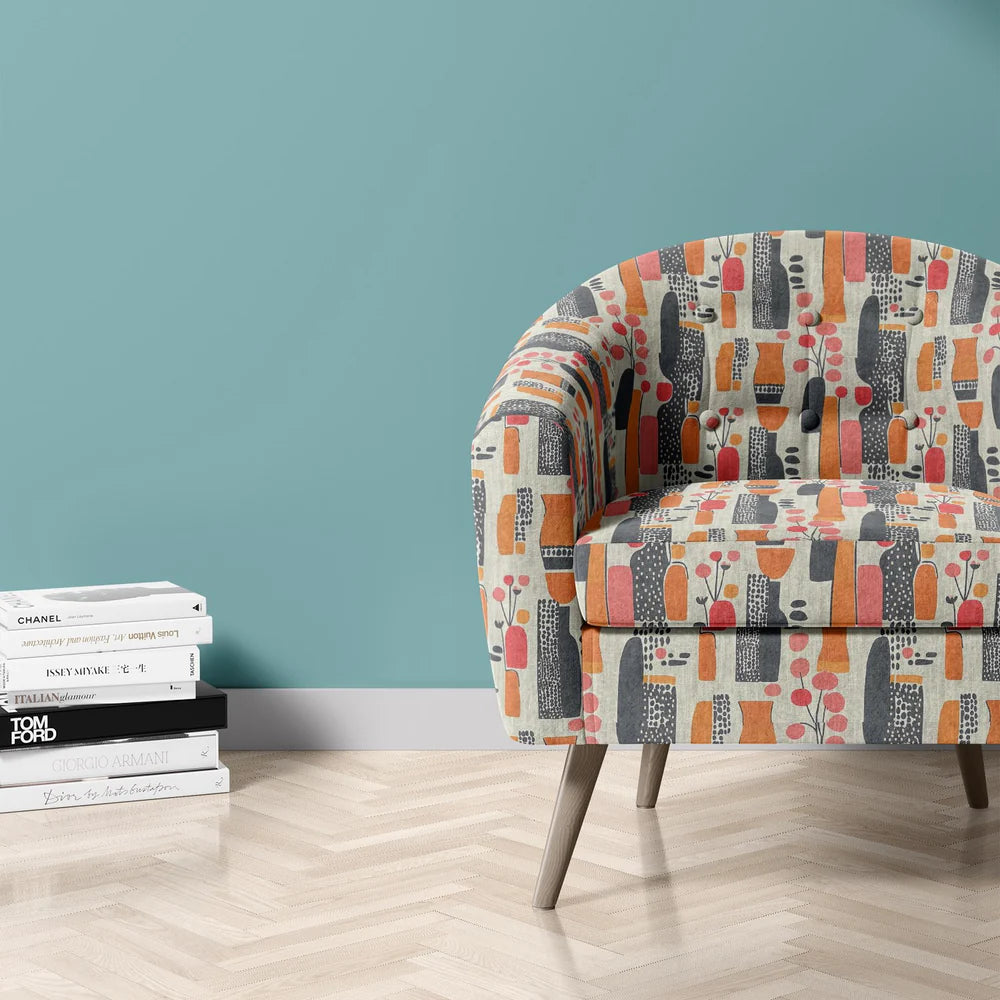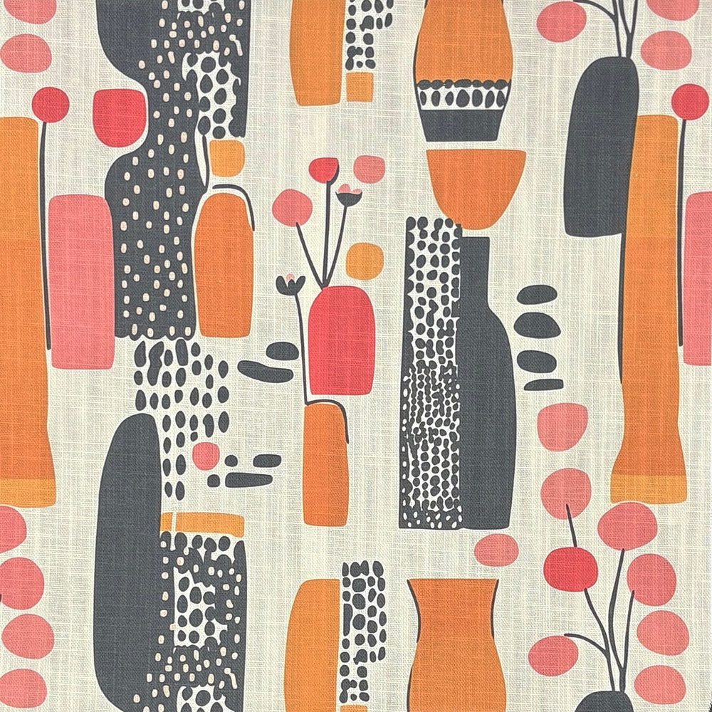 Bold, abstract, and rich with pattern, Tulpan No.18 brings together organic motifs and contemporary colour blocking in a design that’s both lively and sophisticated. Vases, florals, and dotted textures flow across the fabric in a striking palette of terracotta orange, raspberry pink, and charcoal, softened by the natural woven background.
