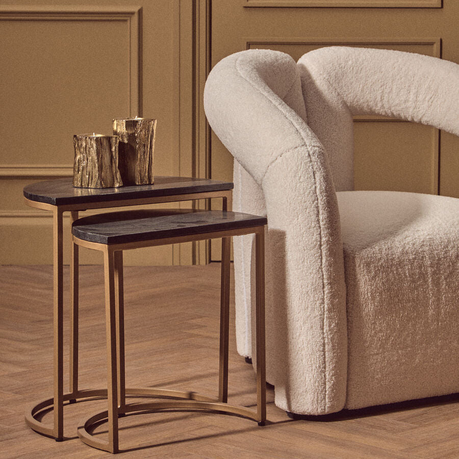 Perfect for compact living rooms, elegant entryways, or bedroom sitting areas. The Nest Of Two Half Moon Black Marble Top Tables pairs beautifully with round mirrors, arched lamps, and textured rugs to echo the soft curves.