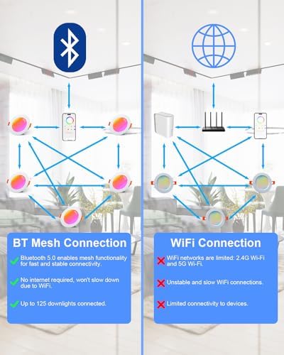 • Excellent multi-lights solution: LED ceiling spotlight equipped with Bluetooth 5.0 chip, which allows automatic interactions between the lights. This helps to overcome the shortcomings of remote control lights and WiFi lights, both in terms of control distance and number of lights.