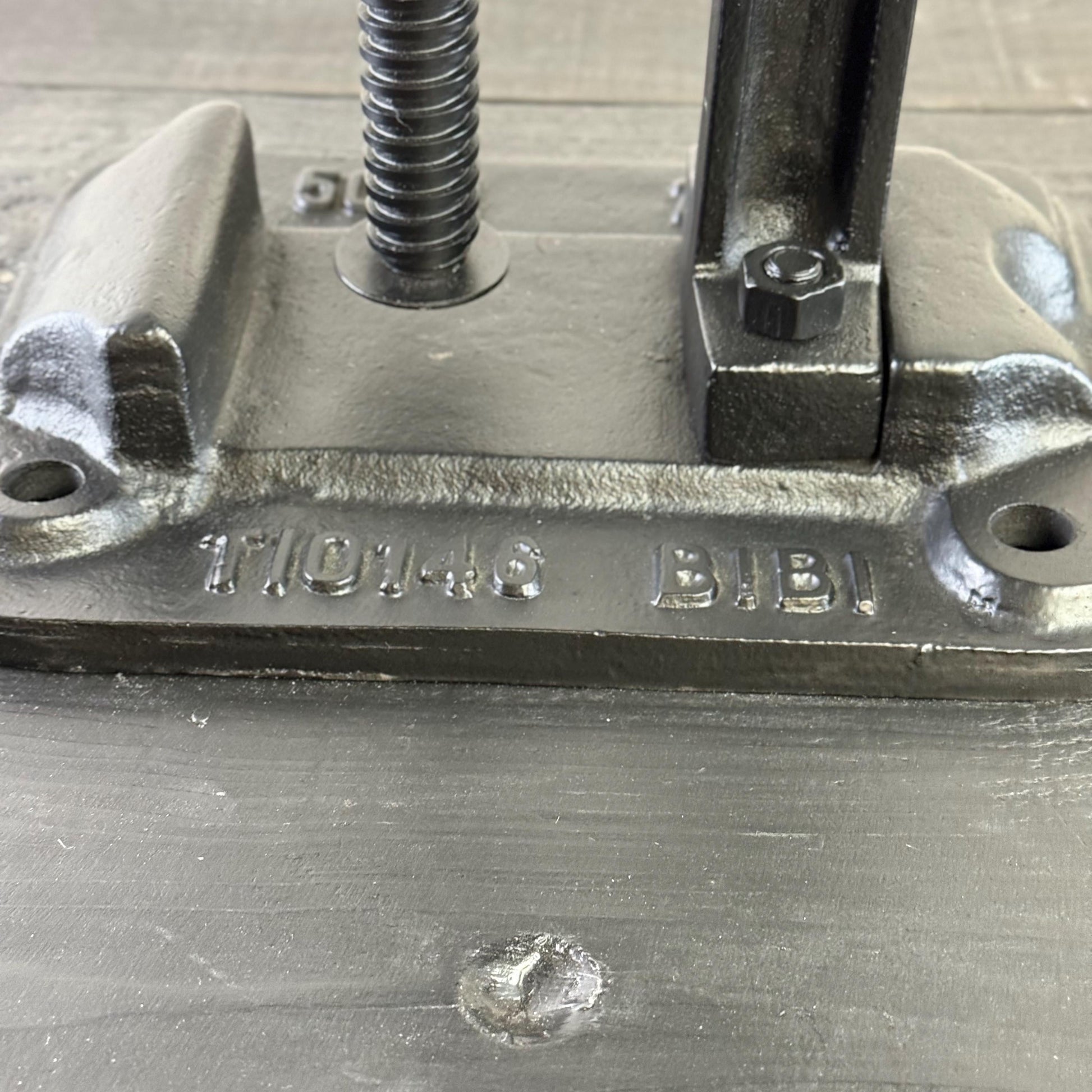 Industrial cast iron adjustable height bar stool and has an adjustment brake to keep at selected height. Vintage style casting with solid turned hand carved wooden top.