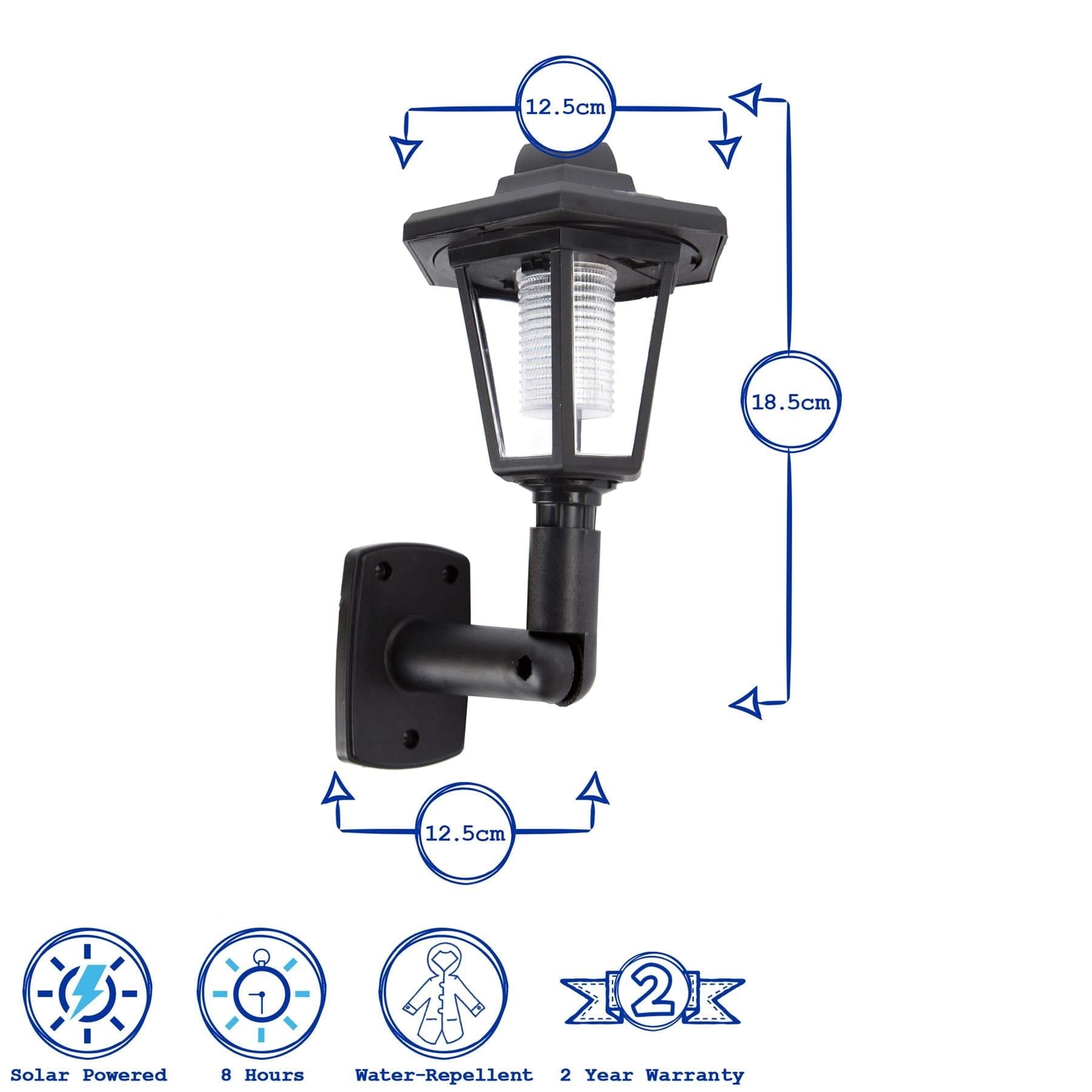 This wall lantern is manufactured from PP & PS material with a 2V/40mA solar panel.