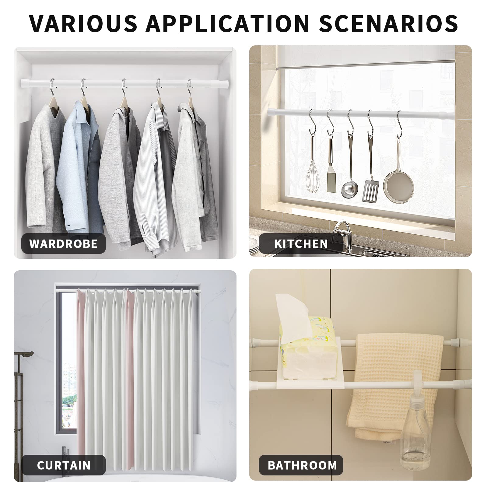 • Wide Application: the shower rod extendable can be used in a variety of wall coverings such as tiles, wallpaper glass and wood. Also can be used as cupboard bar, cafe curtain rod,shower curtain tension rod, wardrobe rod, under sink hanger, DIY storage support and so on.