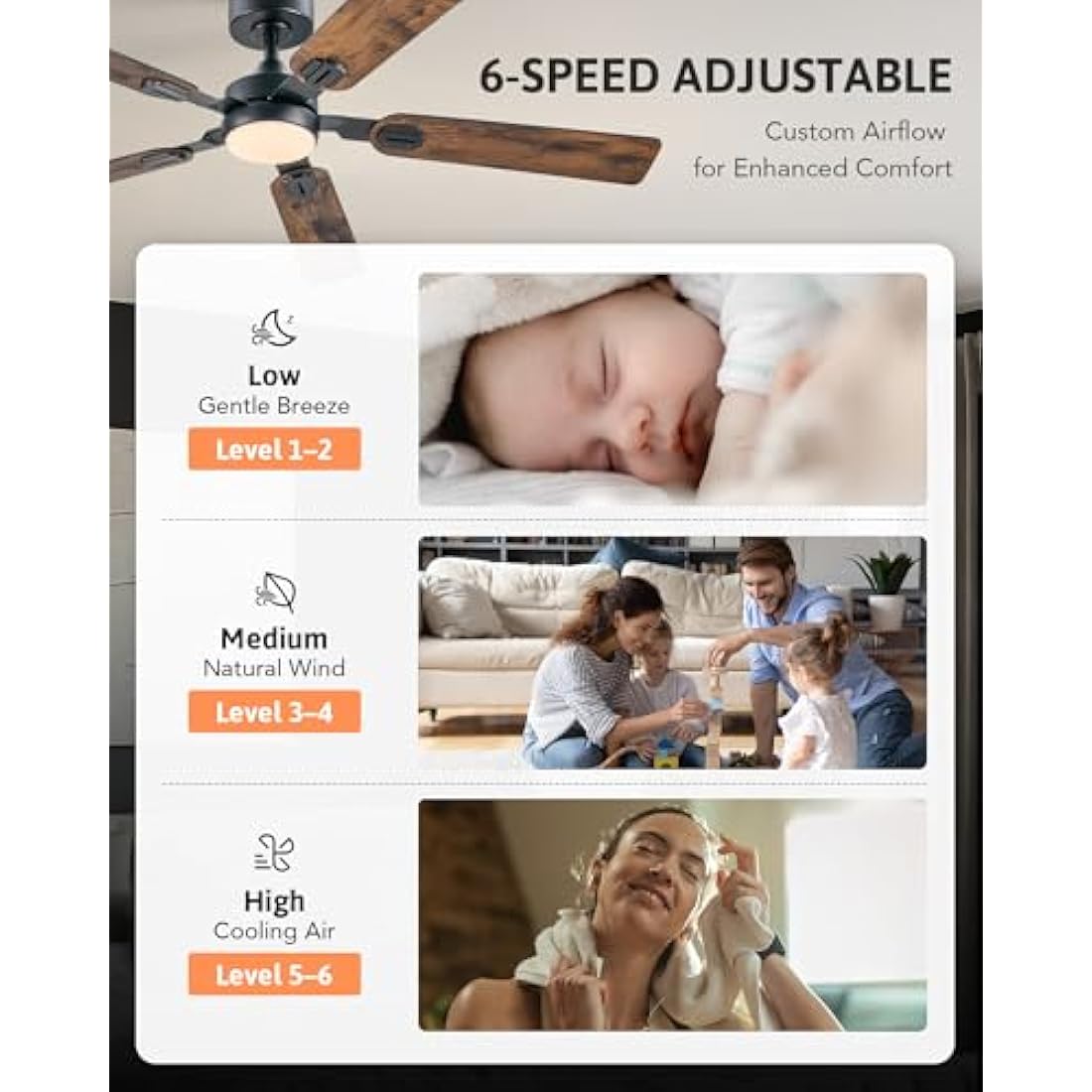【Customize Your Comfort】This ceiling fan with remote allows you to adjust among 6 speeds, 4 timer settings (1/2/4/8 hr.), and 3 color temperatures (3000K/4500K/6500K). Enjoy the flexibility of operating the fan and light separately according to your preference.