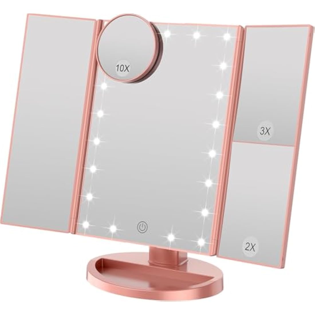 WEILY Tri-fold Vanity Mirror, 21 LEDs and 2X/3X Magnification, Touch Switch for Adjusting Brightness, Dual Power Supply mode Makeup Mirror (Rose Gold)