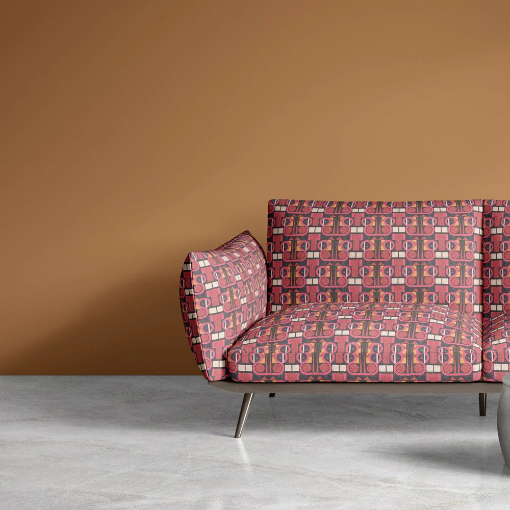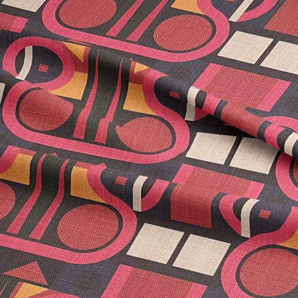 Weimar No.10 Upholstery Fabric combines sculptural curves and vertical symmetry in a palette of deep red, rose, peach, and cream, grounded by dark charcoal lines. Inspired by Bauhaus architecture and mid-century graphics, this red upholstery fabric adds structure and rhythm to any interior.