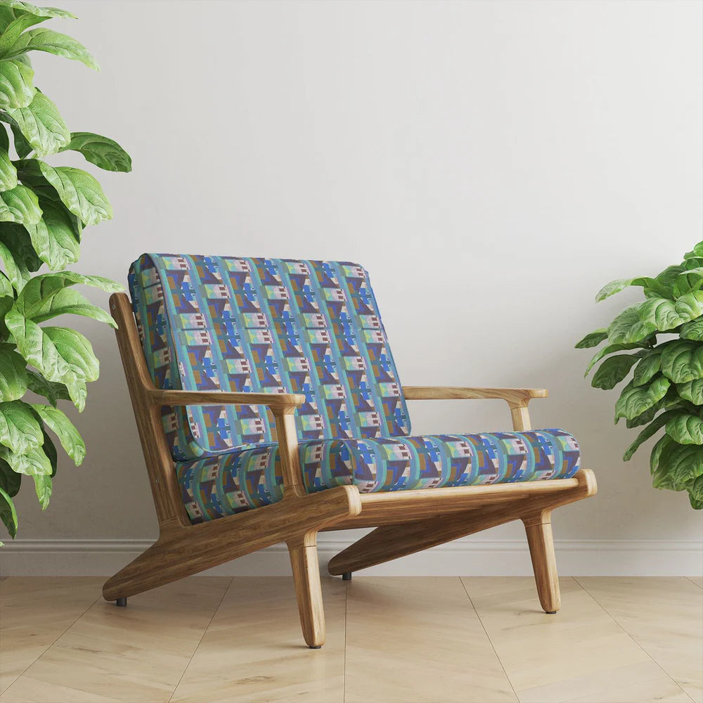 Channel the geometry and precision of the Bauhaus movement with Weimar No.14 Upholstery Fabric – a bold and architectural design woven for the design purist. This statement upholstery fabric is a visual homage to 20th-century modernism, layered with sharp-angled motifs in cobalt blue, forest green, muted violet, and ochre gold. The rhythmic pattern is printed onto a durable linen-blend basecloth, ideal for upholstered seating, panels, and soft furnishing accents.