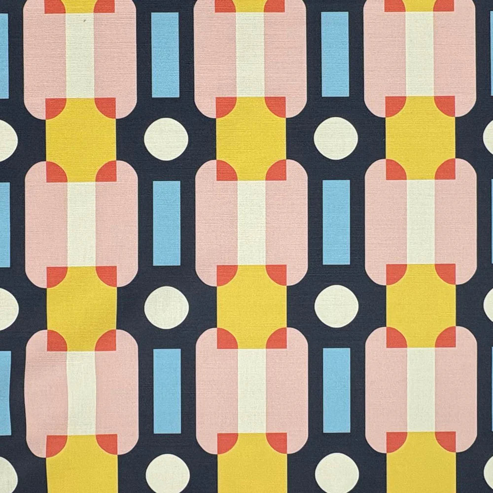 Weimar No.3 Upholstery Fabric offers a joyful take on Bauhaus geometry, with repeating symmetrical shapes in pink, lemon yellow, ivory, and pale blue. The structured layout is softened by playful contrasts, making it a bold yet approachable option for statement interiors.